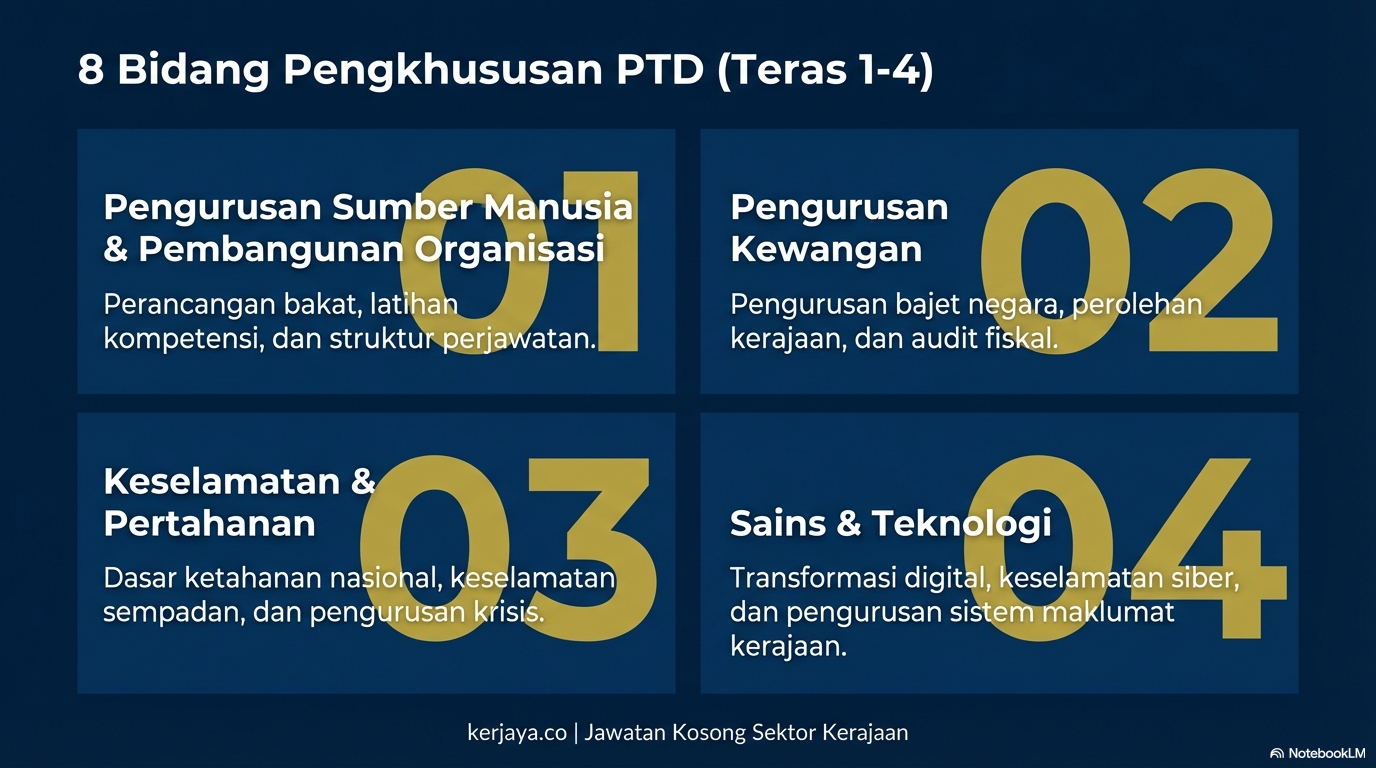 Ramai calon memohon jawatan ini tanpa benar-benar memahami skop tugas sebenar PTD. Artikel ini akan menghuraikan realiti tugas harian PTD serta menerangkan lapan (8) bidang pengkhususan utama yang membentuk kerjaya ini.