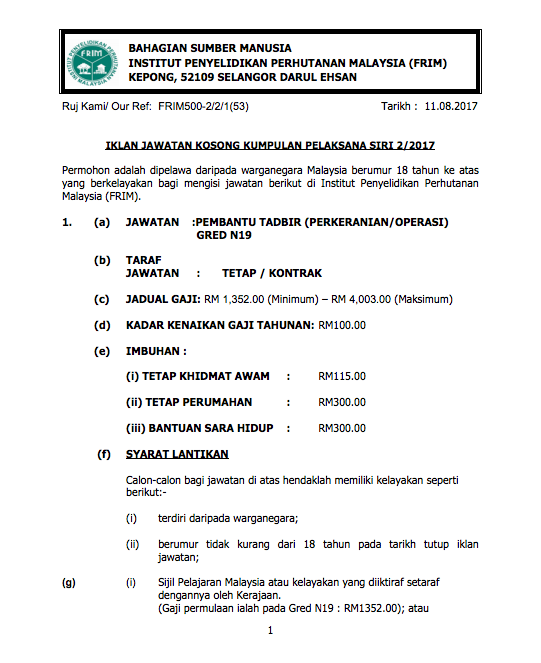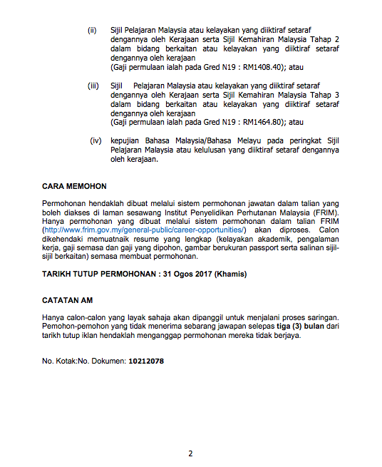 Calon yang layak dipelawa untuk memohon seperti yang diiklankan di bawah. Klik pautan “IKLAN JAWATAN FRIM” di bawah dan rujuk maklumat permohonan, syarat dan tarikh tutup permohonan kerja tersebut.