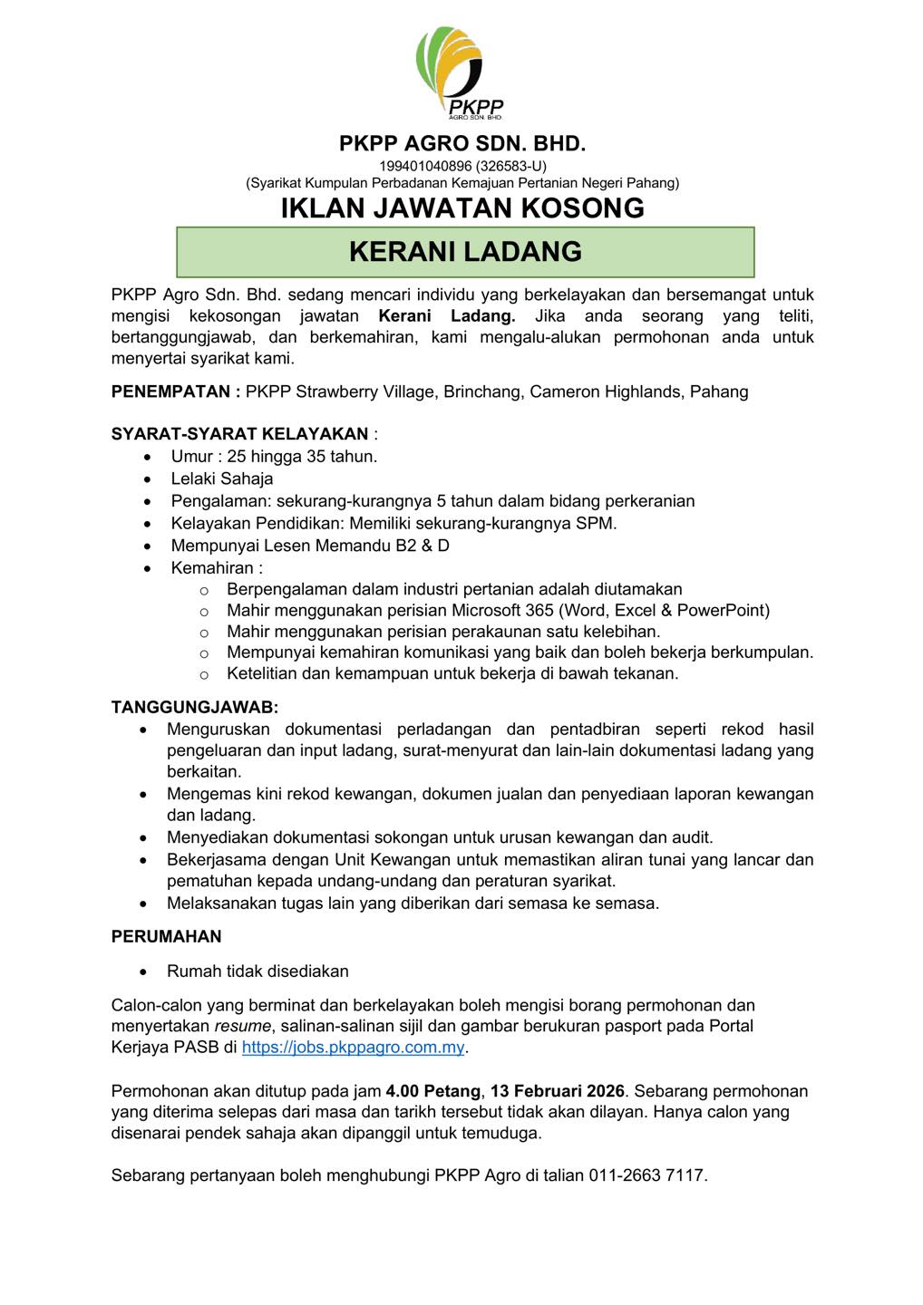 Iklan Kini Jawatan PKPP Agro Sdn Bhd