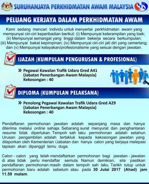 Anda juga boleh rujuk Iklan Jawatan Kosong Pegawai Kawalan Trafik Udara di bawah. Klik untuk muat turun sebagai rujukan.
