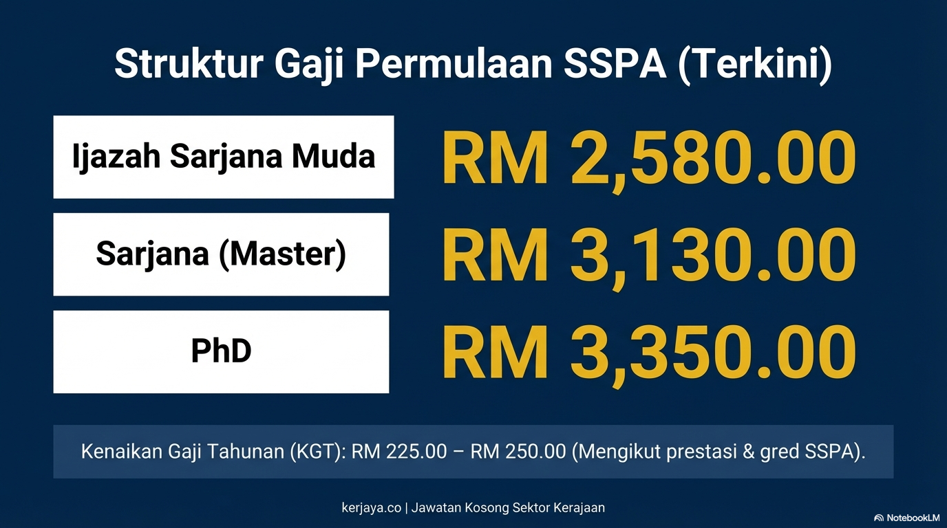 Anggaran Pendapatan Kasar: Seorang pemegang Ijazah Sarjana Muda yang ditempatkan di bandar besar boleh menerima sekitar RM3,530.00 sebulan pada tahun pertama lantikan, tidak termasuk faedah perubatan dan elaun tambahan lain.