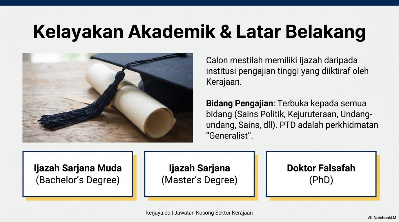 Secara asasnya, permohonan terbuka kepada pelbagai latar belakang akademik. Namun, graduan dalam bidang profesional khusus seperti perubatan dan farmasi kurang digalakkan kerana mereka telah dilatih untuk laluan perkhidmatan tersendiri.