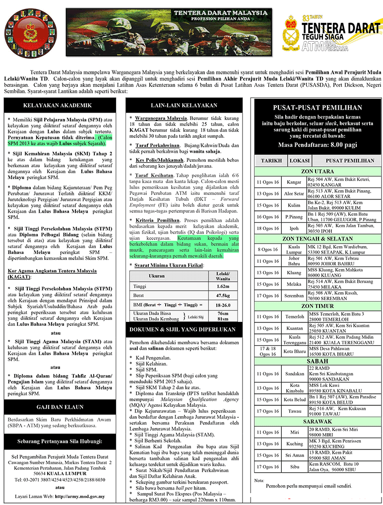 Tentera Darat Malaysia mempelawa Warganegara Malaysia yang berkelayakan dan memenuhi syarat untuk menghadiri sesi Pemilihan Awal Perajurit Muda Lelaki/Wanita TD seperti yang diiklankan di bawah: