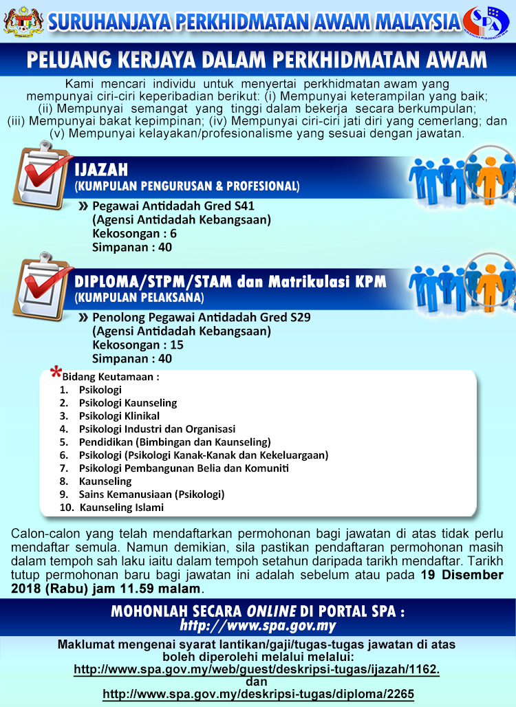 Sekiranya anda, seorang Warganegara Malaysia yang cukup syarat kelayakan dan berumur tidak kurang daripada 18 tahun pada tarikh tutup iklan jawatan adalah dipelawa untuk memohon bagi mengisi kekosongan jawatan tetap atau kontrak yang diiklankan.
