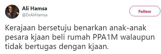 Namun, Ketua Setiausaha Negara, Tan Sri Dr Ali Hamsa baru-baru ini telah mengeluarkan kenyataan bahawa anak pesara kerajaan juga kini berpeluang nutuk membeli rumah mampu milik di bawah Skim PPA1M walaupun tidak bertugas dengan kerajaan.