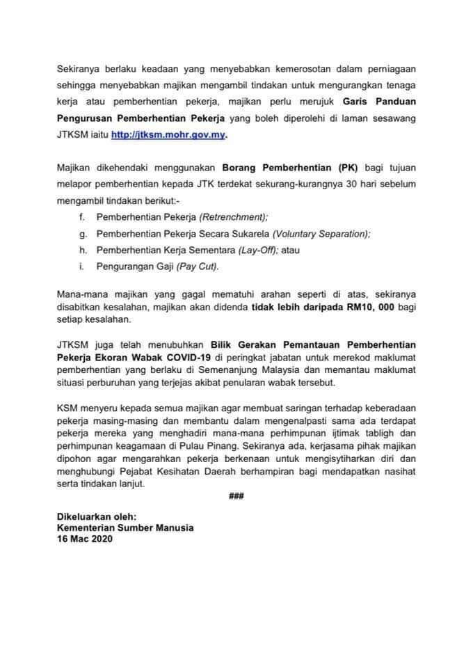 Kementerian juga meminta majikan merujuk garis panduan pengurusan pemberhentian pekerja yang boleh diperolehi di laman sesawang Jabatan Tenaga Kerja Semenanjung Malaysia (JTKSM) sekiranya perlu mengurangkan tenaga kerja akibat kemerosotan dalam perniagaan.