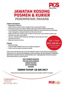 Perhatian kepada pemohon yang berminat. Untuk makluman permohonan jawatan ini adalah secara terus melalui Pos Malaysia. Sila ikuti langkah memohon yang disiarkan dalam iklan kekosongan jawatan di bawah agar anda tidak terlepas menjawat jawatan ini.