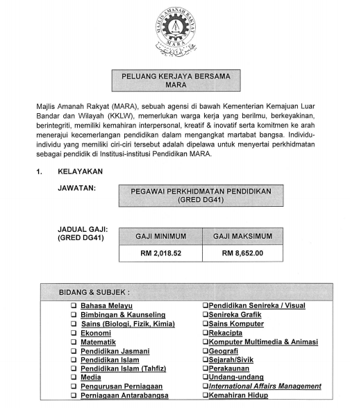 Klik sini untuk muat turun iklan jawatan kosong Pegawai Perkhidmatan Pendidikan seperti yang disiarkan di laman MARA di bawah dan save as sebagai rujukan permohonan anda.
