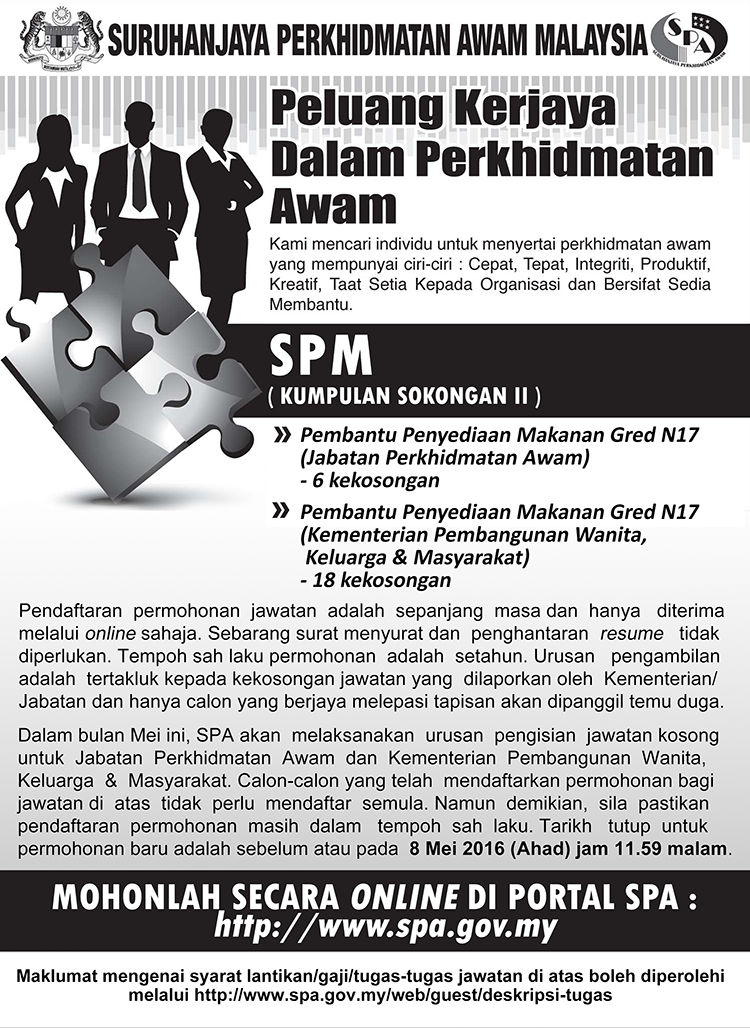 Terkini Suruhanjaya Perkhidmatan Awam Malaysia (SPA) menawarkan pengambilan jawatan bagi pihak Jabatan Perkhidmatan Awam & Kementerian Pembangunan Wanita, Keluarga & Masyarakat untuk mengisi kekosongan jawatan seperti diiklankan di bawah.