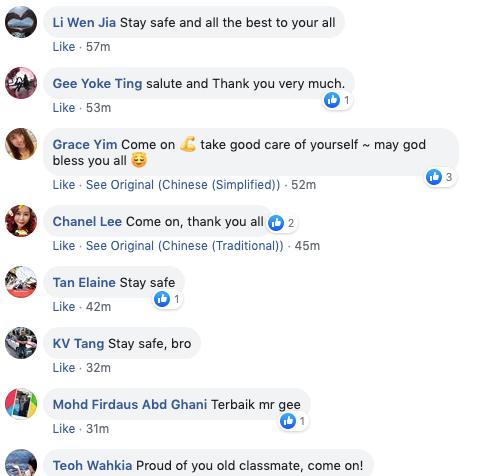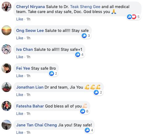 Menerusi gambar yang dimuat naik di laman tersebut dan menerima lebih 4,000 tanda suka di Facebook, Dr Gee Teak Sheng memberitahu bahawa mereka (petugas kesihatan) masih bertugas demi orang awam jadi sebagai individu yang ebrtanggungjawab, dia meminta semua orang duduk di rumah sahaja.