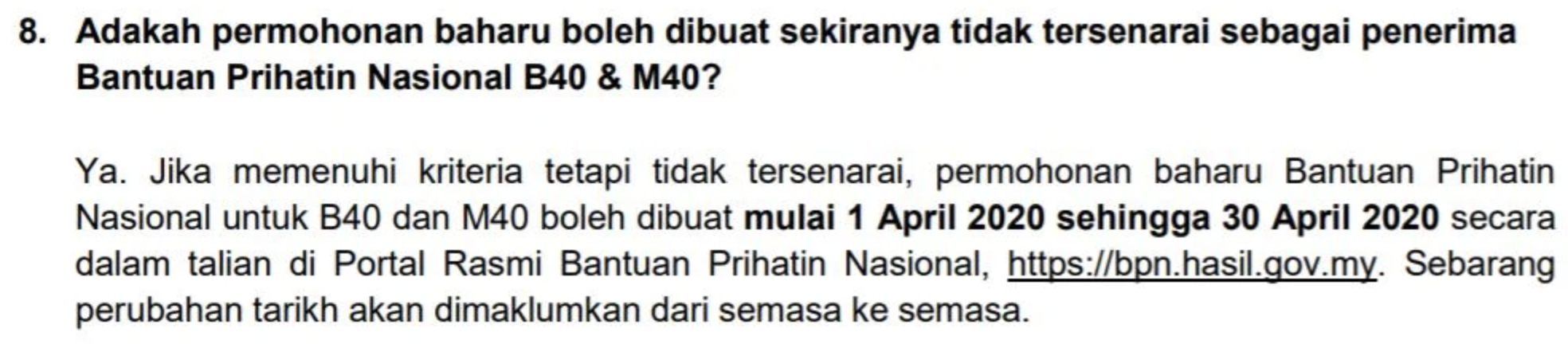 Jika anda membuat permohonan baru dalam tempoh 1 April 2020 sehingga 30 April 2020, permohonan ini termasuk dalam permohonan baru. Ia dijelaskan di sini: