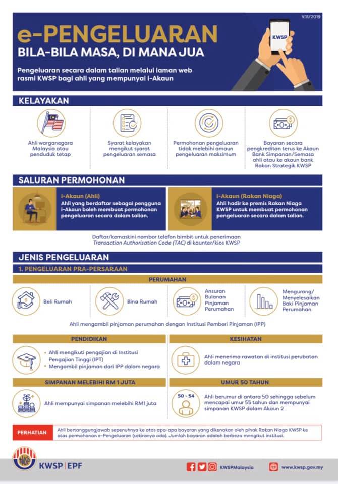 Melalui I-Akaun anda boleh melakukan pengeluaran KWSP secara online melalui laman web rasmi KWSP pada bila-bila masa.
