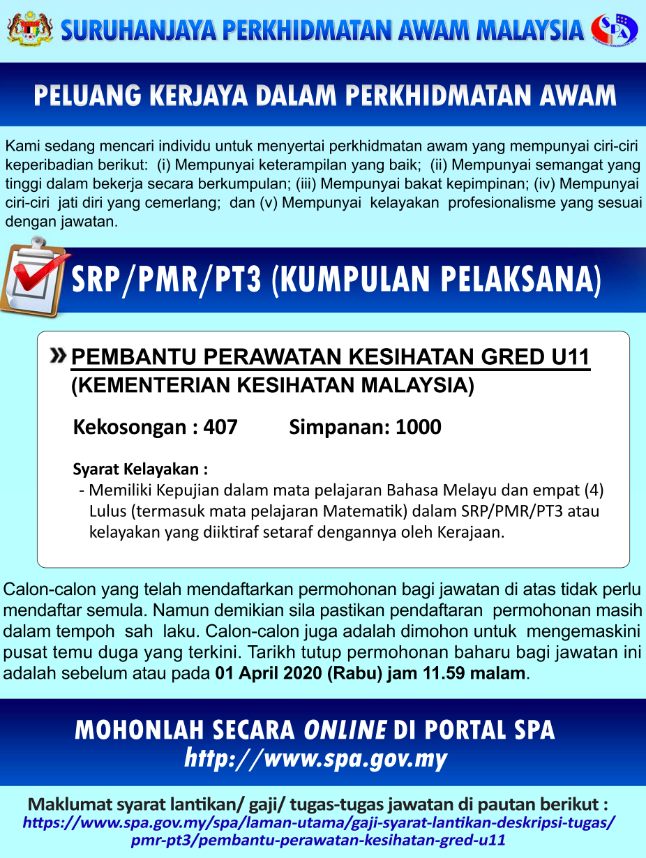 Berikut merupakan iklan permohonan rasmi Pembantu Perawatan Kesihatan U11 yang dikeluarkan oleh SPA Malaysia.