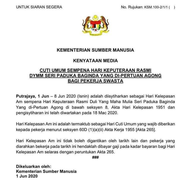 Isnin (8 Jun) diisytiharkan sebagai hari kelepasan am bersempena Hari Keputeraan Rasmi Yang di-Pertuan Agong Al-Sultan Abdullah Ri’ayatuddin Al-Mustafa Billah Shah.