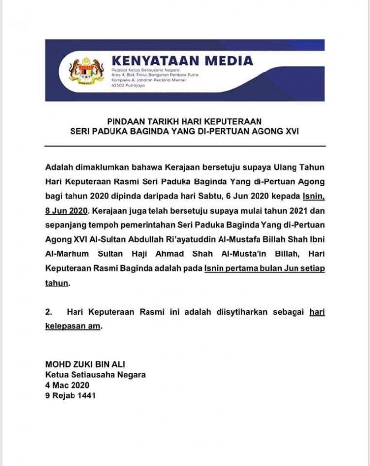 Kerajaan telah bersetuju untuk meminda Tarikh Ulang Tahun Hari Keputeraan Rasmi Yang di-Pertuan Agong, Al-Sultan Abdullah Ri’ayatuddin Al- Mustafa Billah Shah daripada 6 Jun kepada 8 Jun 2020 bersamaan hari Isnin.