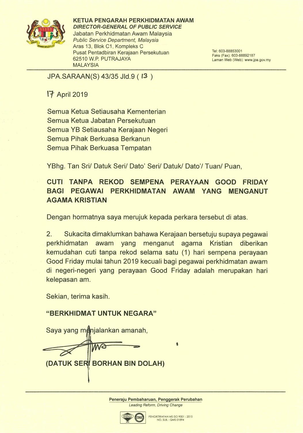 Jabatan Perkhidmatan Awam (JPA) melalui satu surat mengumumkan berita gembira apabila Kerajaan bersetuju memberikan cuti tanpa rekod sempena sambutan Good Friday bagi Pegawai Perkhidmatan Awam yang menganut agama Kristian.