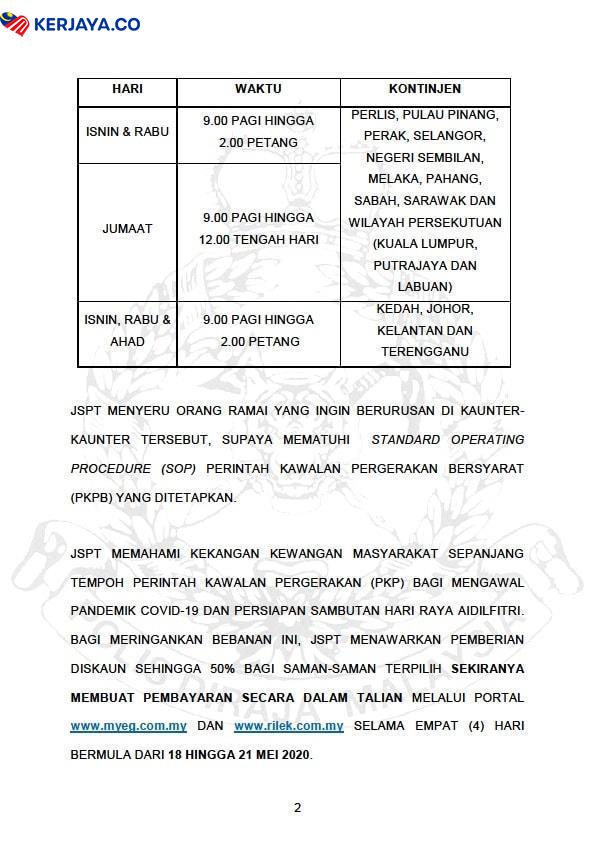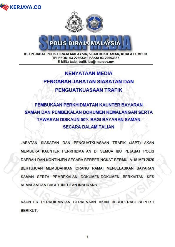 Jabatan Siasatan dan Penguatkuasaan Trafik (JSPT) melancar kempen bayaran saman secara ‘e-payment’ bermula 18 Mei hingga 21 Mei ini, dengan pemberian diskaun sebanyak 50 peratus bersempena Peringatan Hari Polis ke-2.