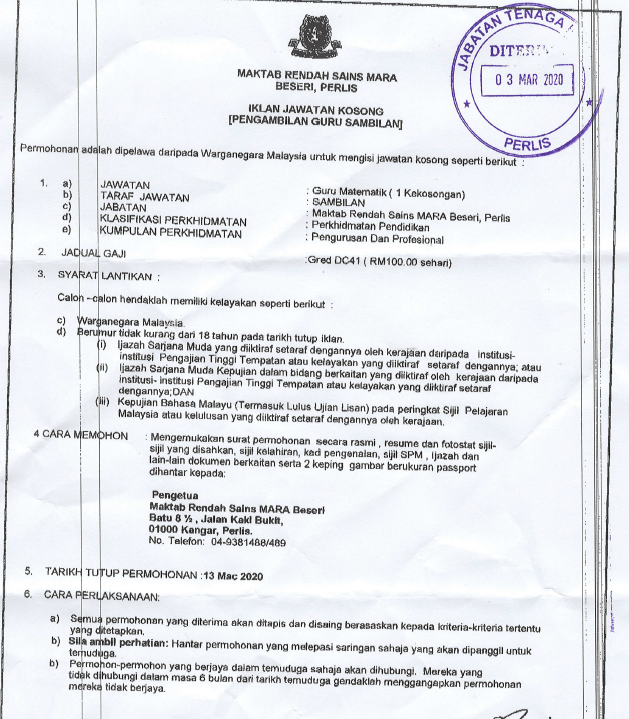 Permohonan Jawatan Kosong Maktab Rendah Sains Mara (MRSM).