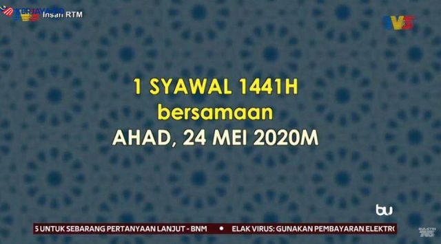 “Bagi menyempurnakan titah perintah Ke Bawah Duli Yang Maha Mulia Seri Paduka Baginda Yang di-Pertuan Agong, setelah diperkenankan oleh Duli-Duli Yang Maha Mulia Raja-Raja, maka adalah dengan ini saya mengisytiharkan bahawa tarikh Hari Raya Puasa bagi negeri-negeri seluruh Malaysia ialah pada hari Ahad, 24 Mei 2020,” katanya.