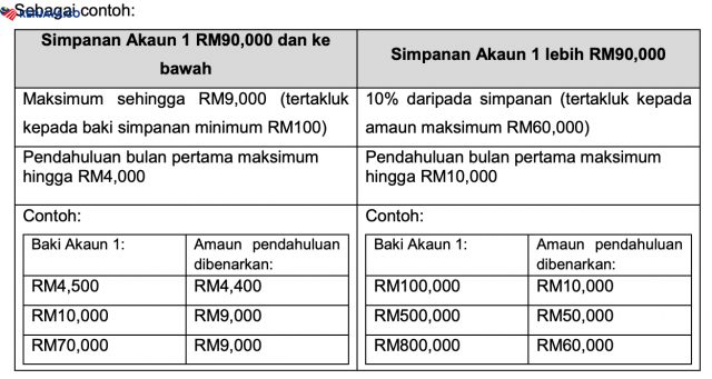 a. Ahli yang mempunyai baki RM90,000 dan ke bawah (Akaun 1), akan mempunyai akses kepada amaun sehingga RM9,000. Amaun pendahuluan ini akan dikreditkan secara berkala sehingga enam (6) bulan dengan pendahuluan pertama sehingga RM4,000.