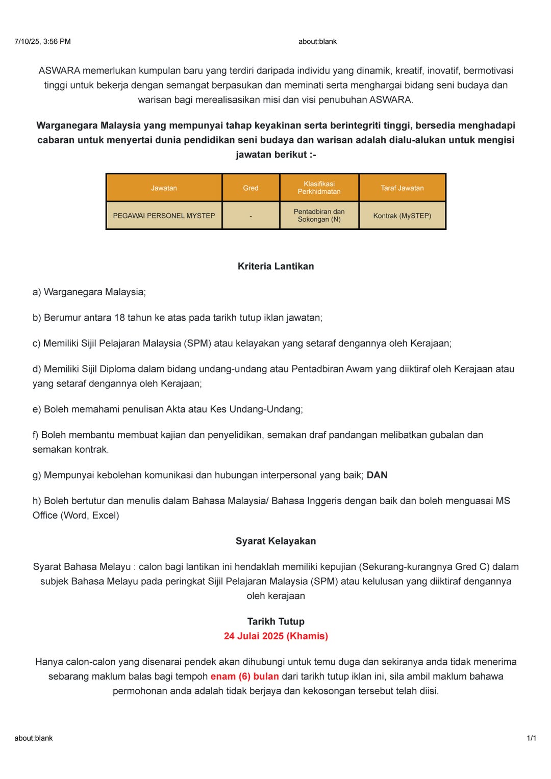 Iklan Jawatan Akademi Seni Budaya Dan Warisan Kebangsaan (ASWARA)