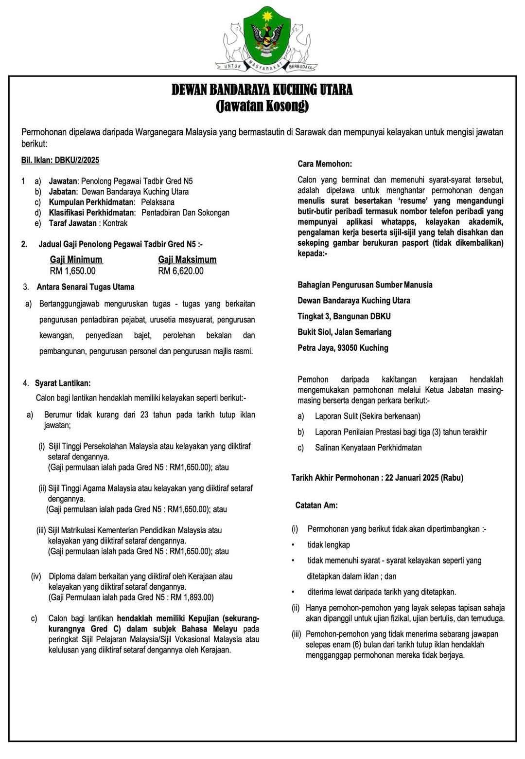 Iklan Jawatan Dewan Bandaraya Kuching Utara (DBKU)