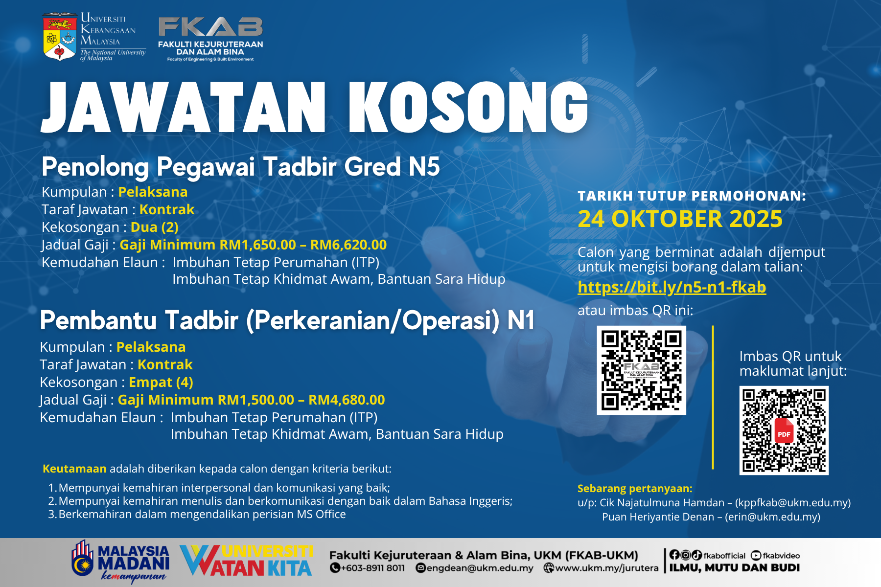Iklan Jawatan Fakulti Kejuruteraan dan Alam Bina (FKAB), Universiti Kebangsaan Malaysia IKLAN PENUH JAWATAN BORANG PERMOHONAN