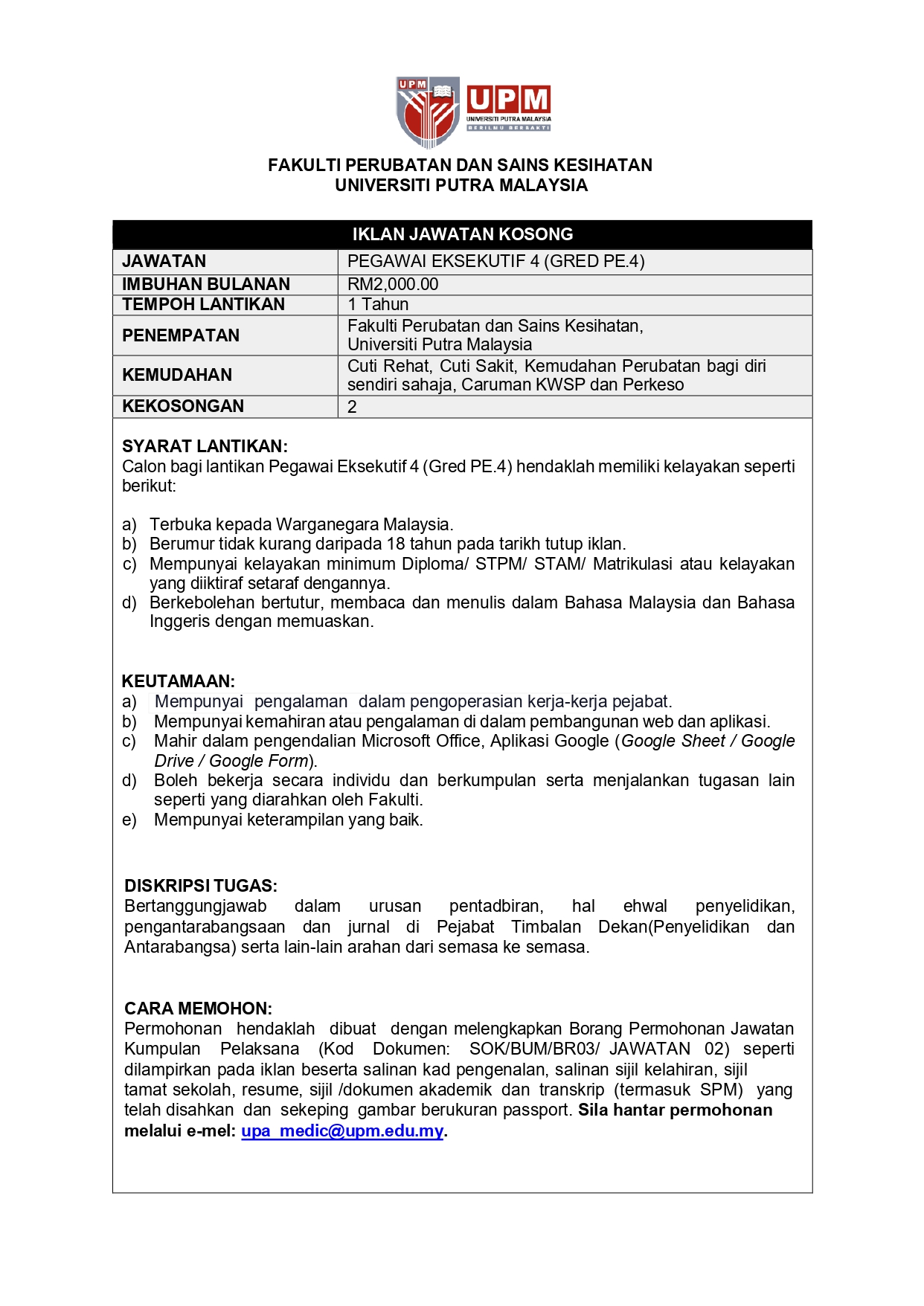 Iklan Jawatan Fakulti Perubatan dan Sains Kesihatan, Universiti Putra Malaysia (UPM) IKLAN PENUH JAWATAN