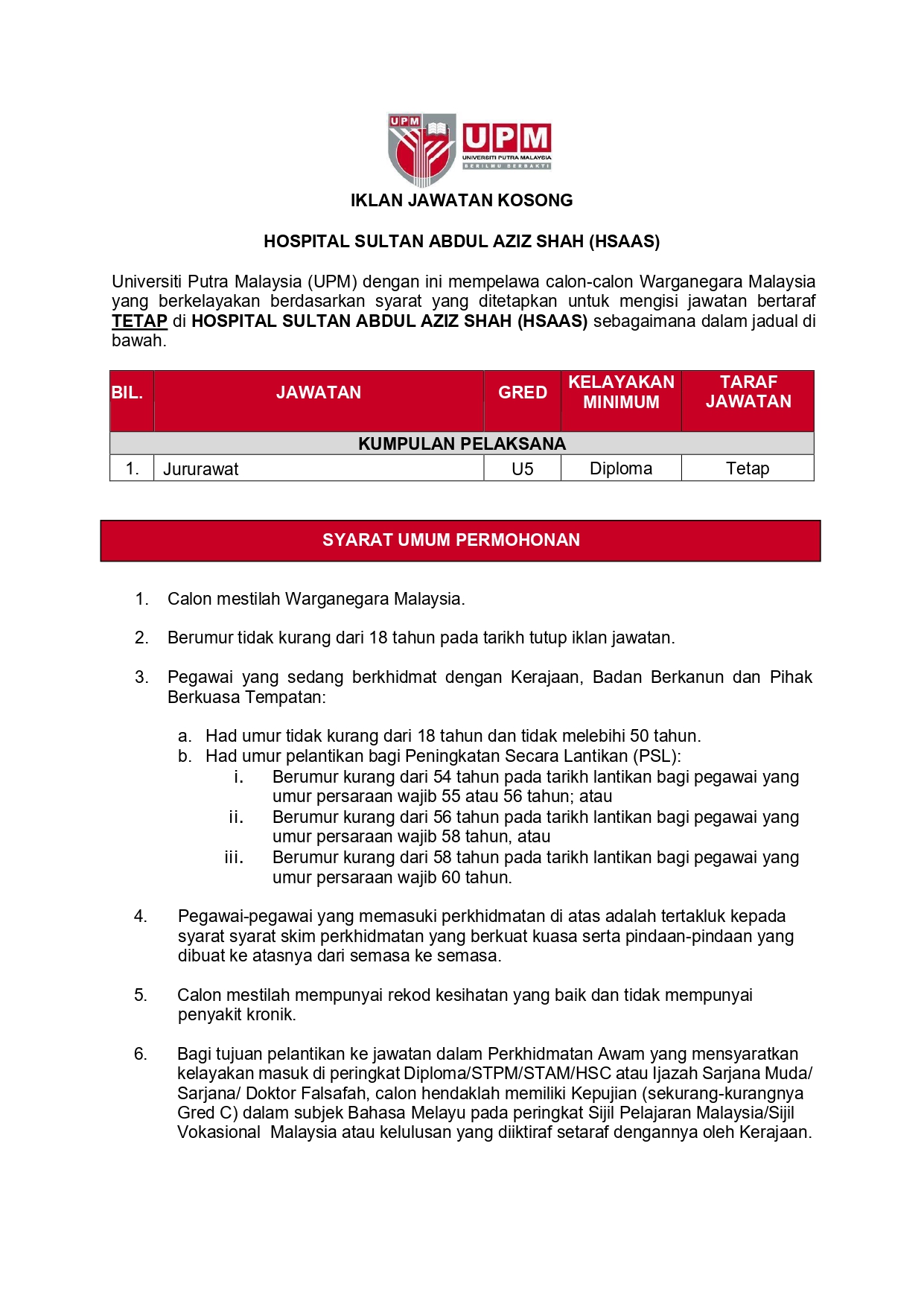 Iklan Jawatan Hospital Sultan Abdul Aziz Shah (HSAAS)
