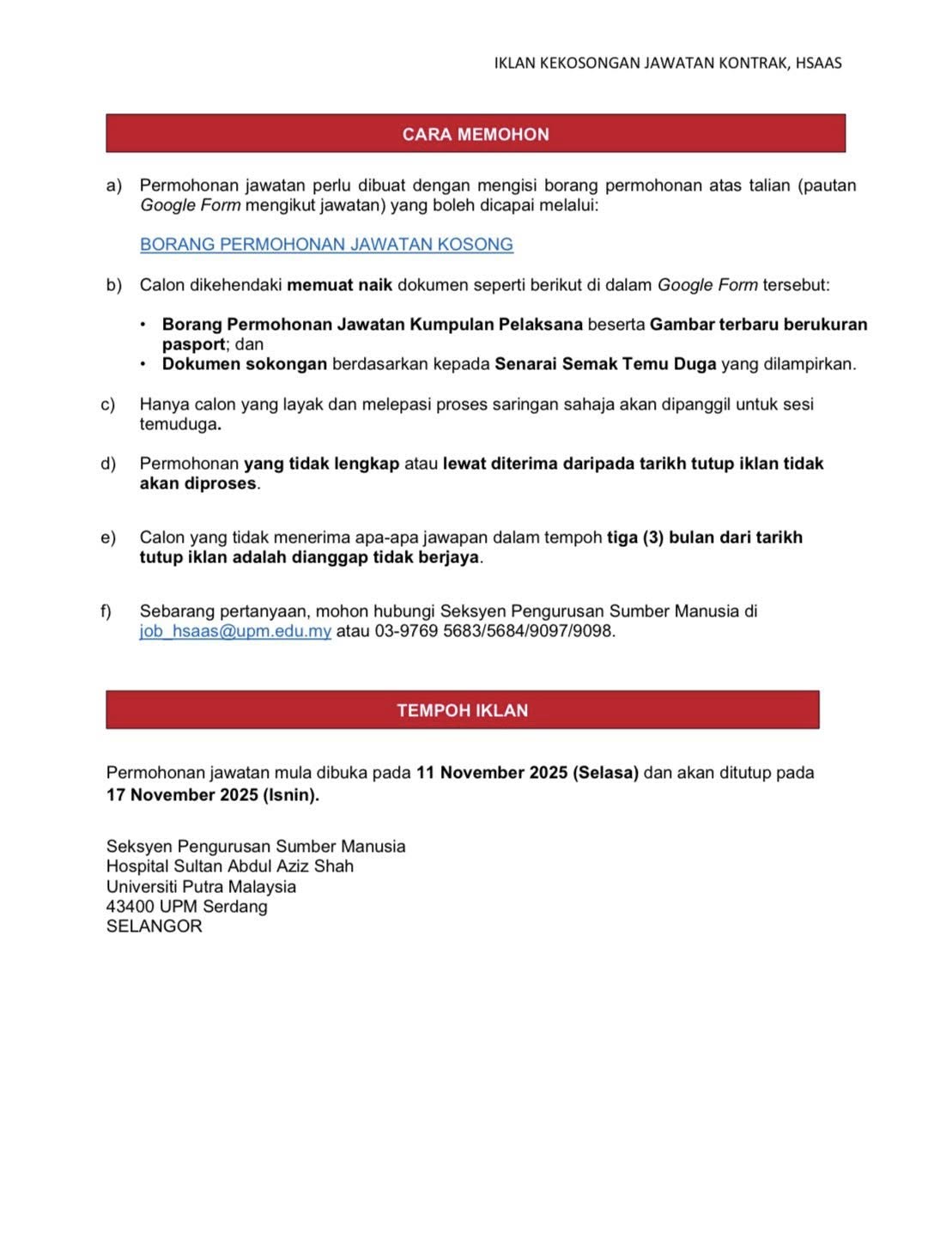 Iklan Jawatan Hospital Sultan Abdul Aziz Shah (HSAAS)