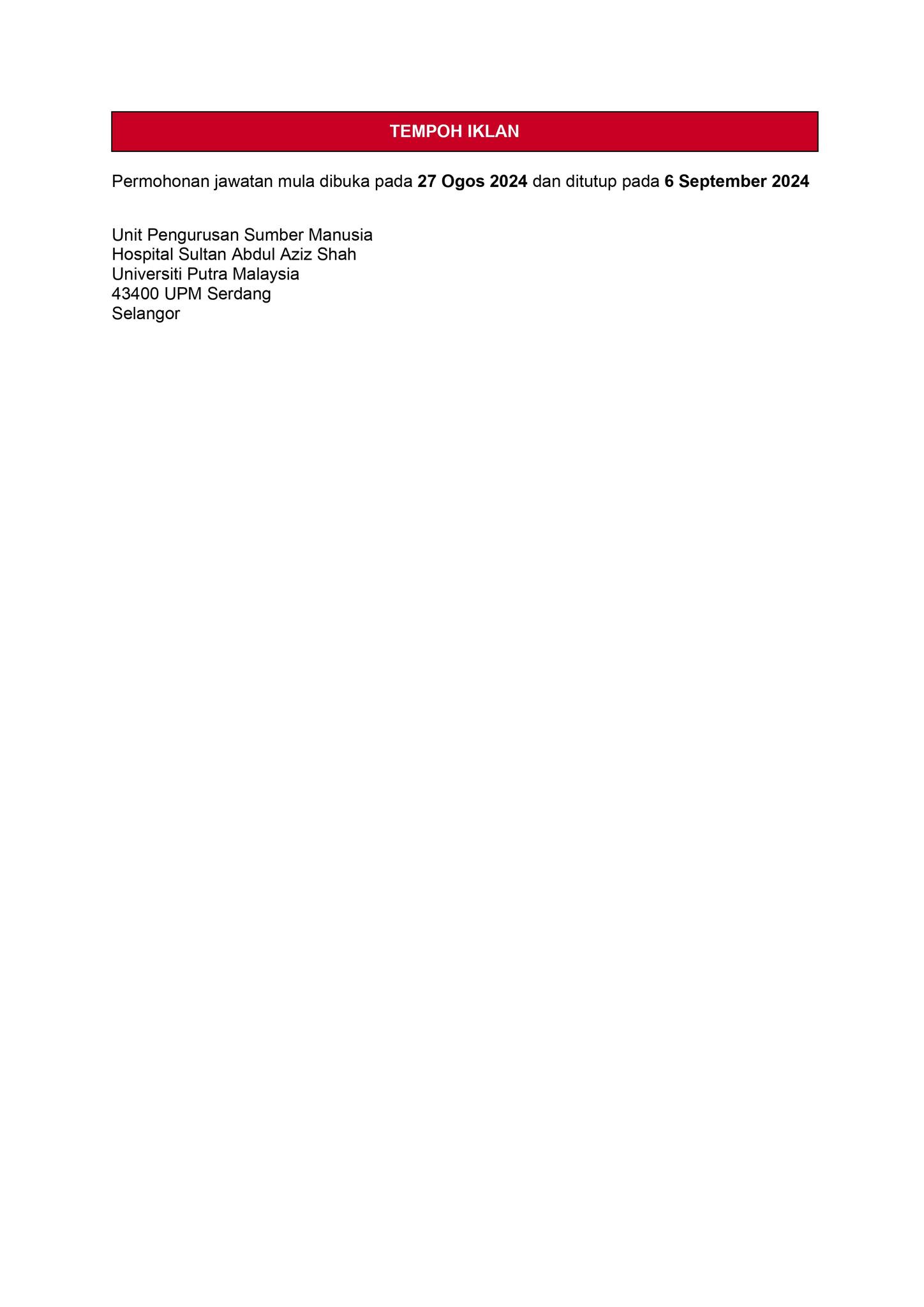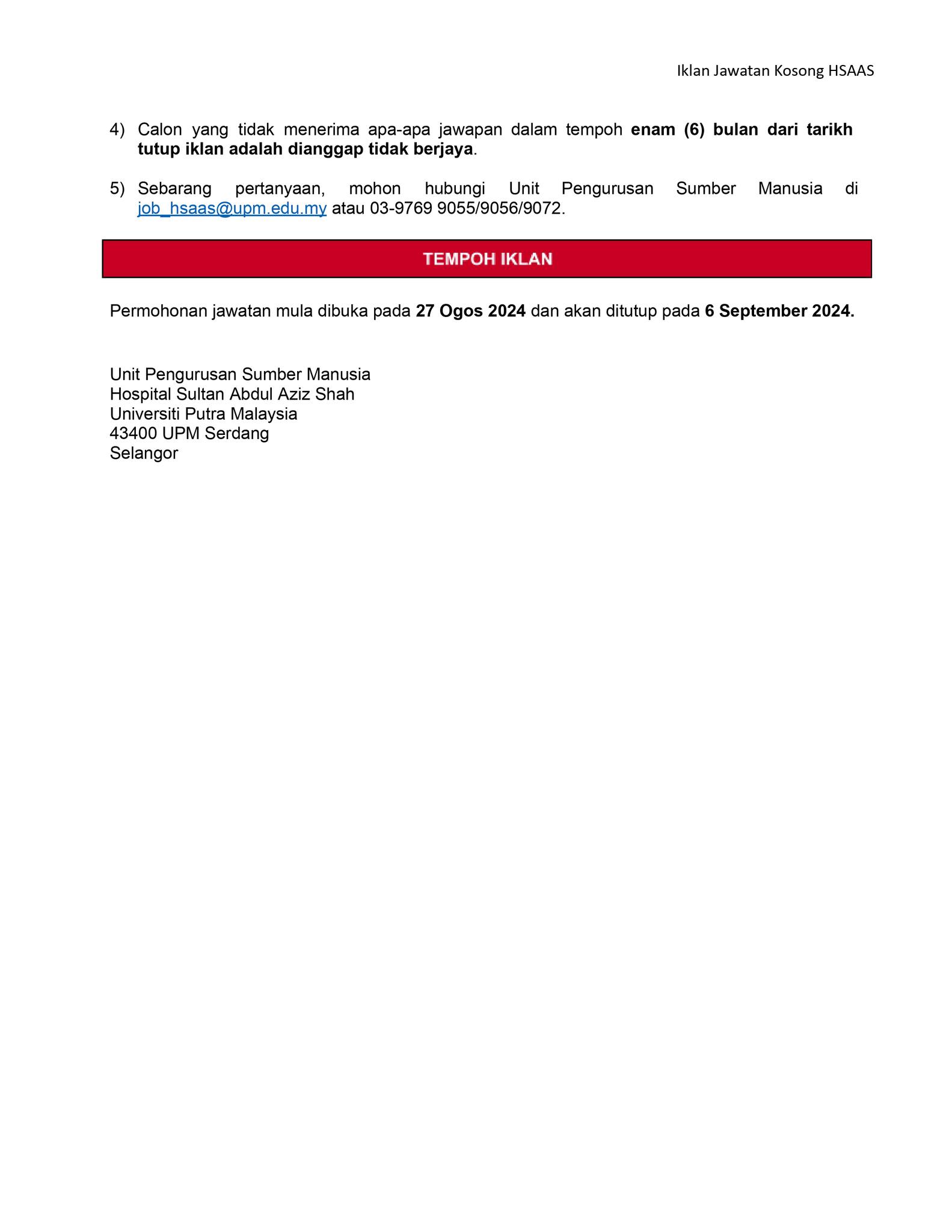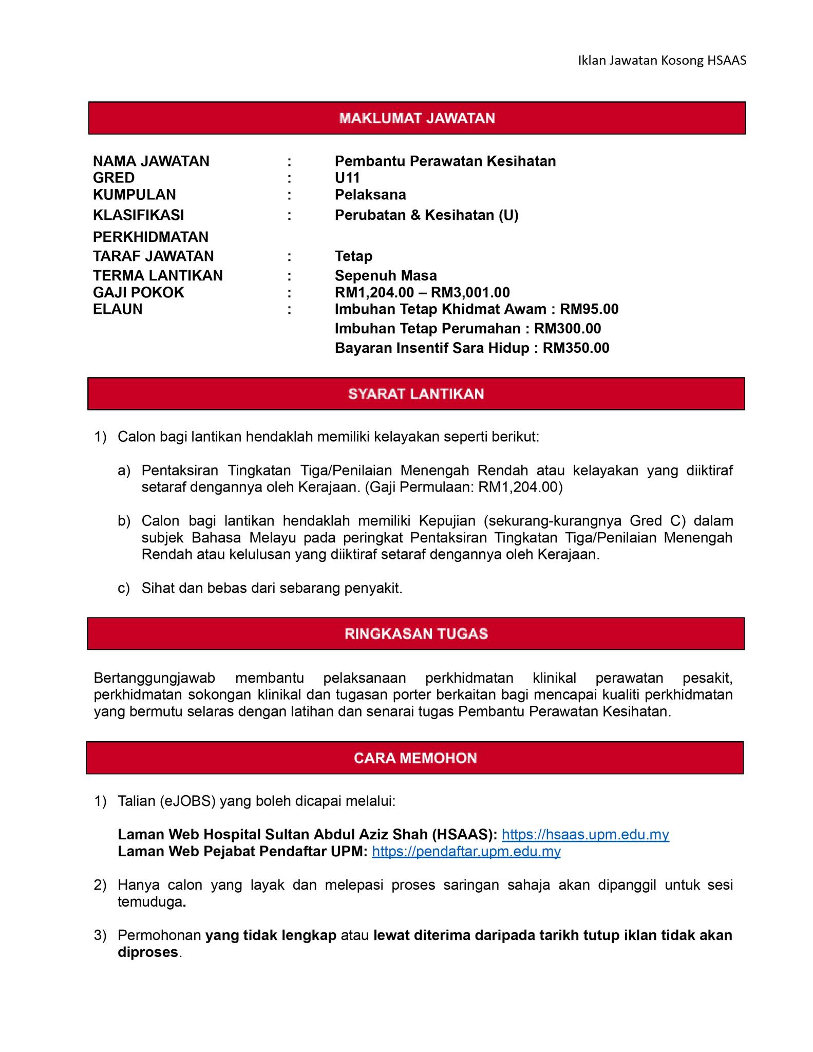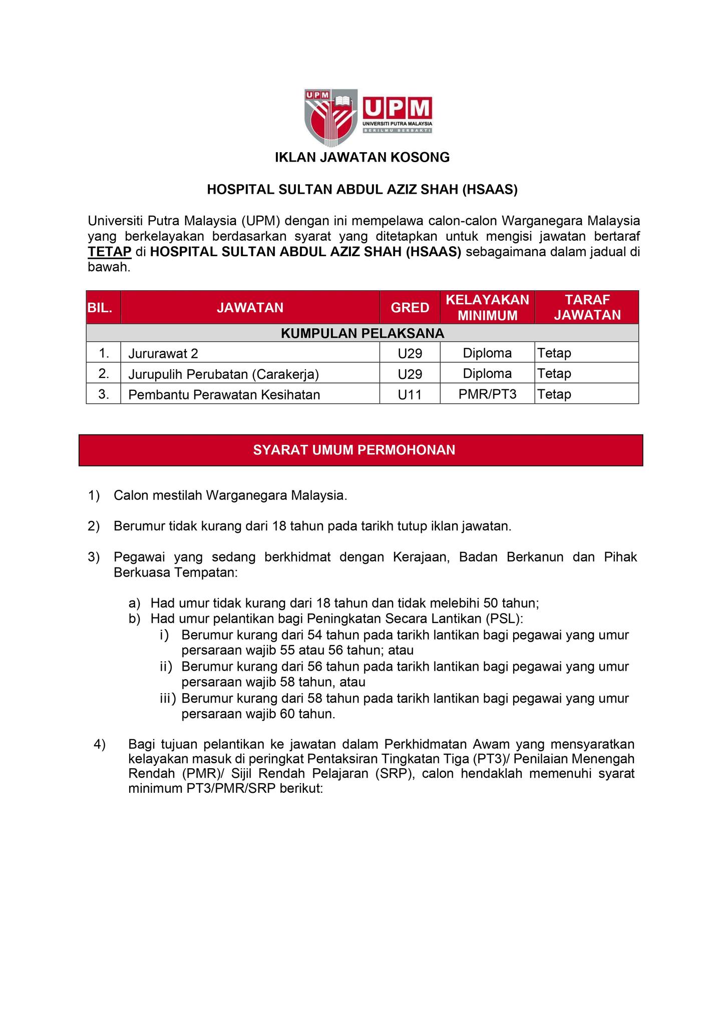 Iklan Jawatan Hospital Sultan Abdul Aziz Shah (HSAAS)