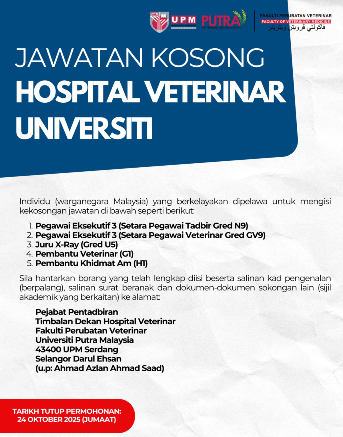 Iklan Jawatan Hospital Veterinar Universiti, Universiti Putra Malaysia (UPM)