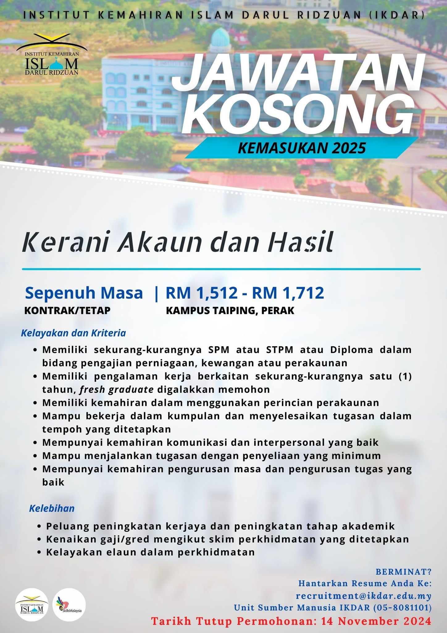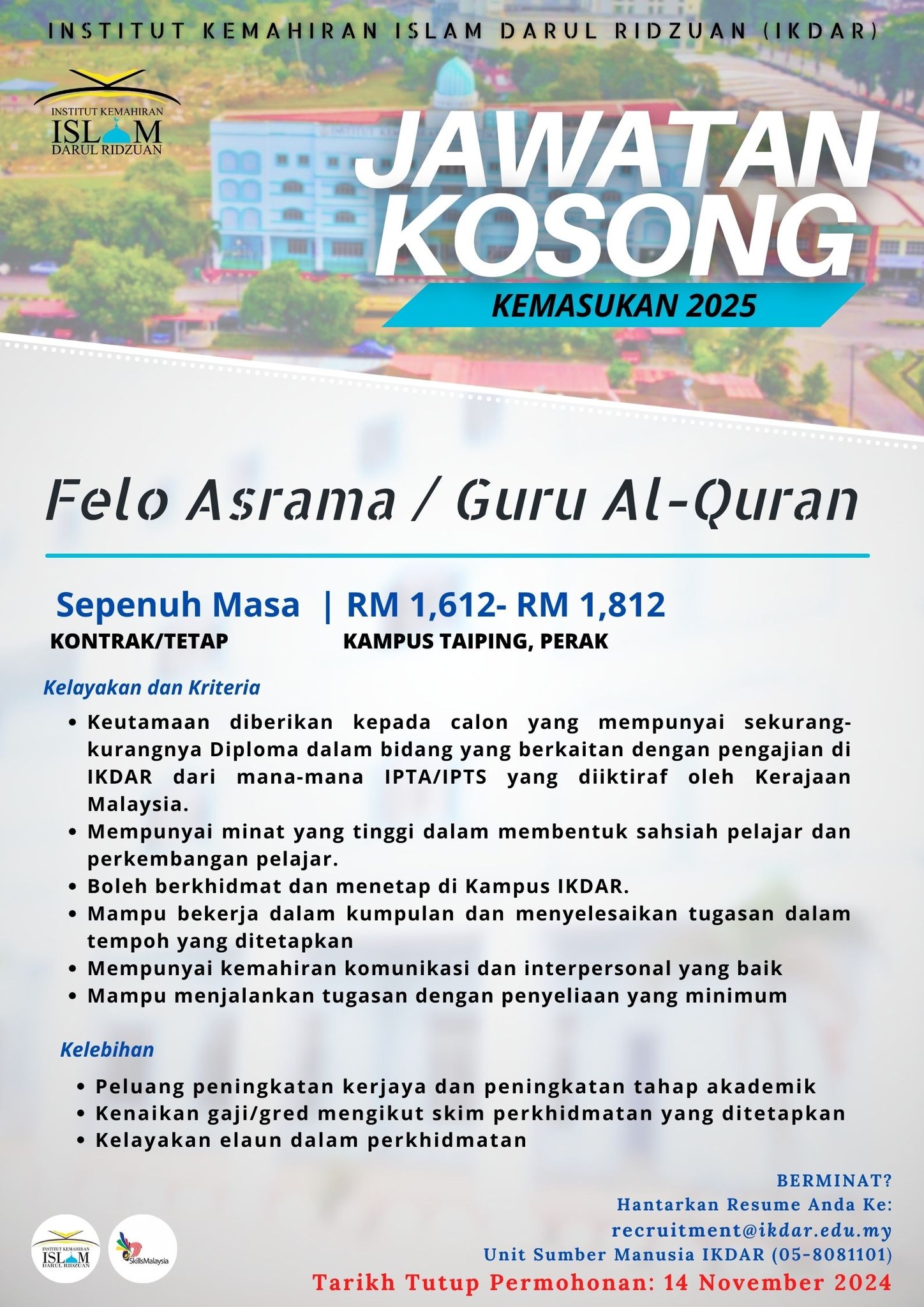 Iklan Jawatan Institut Kemahiran Islam Darul Ridzuan (IKDAR)
