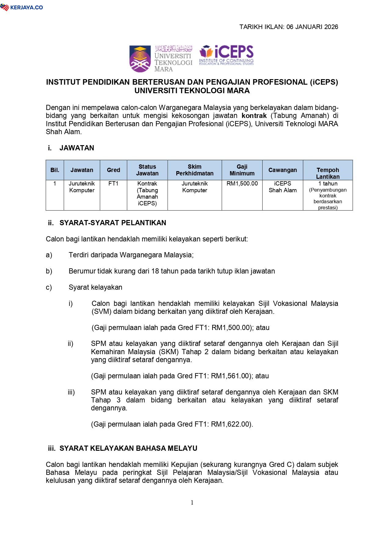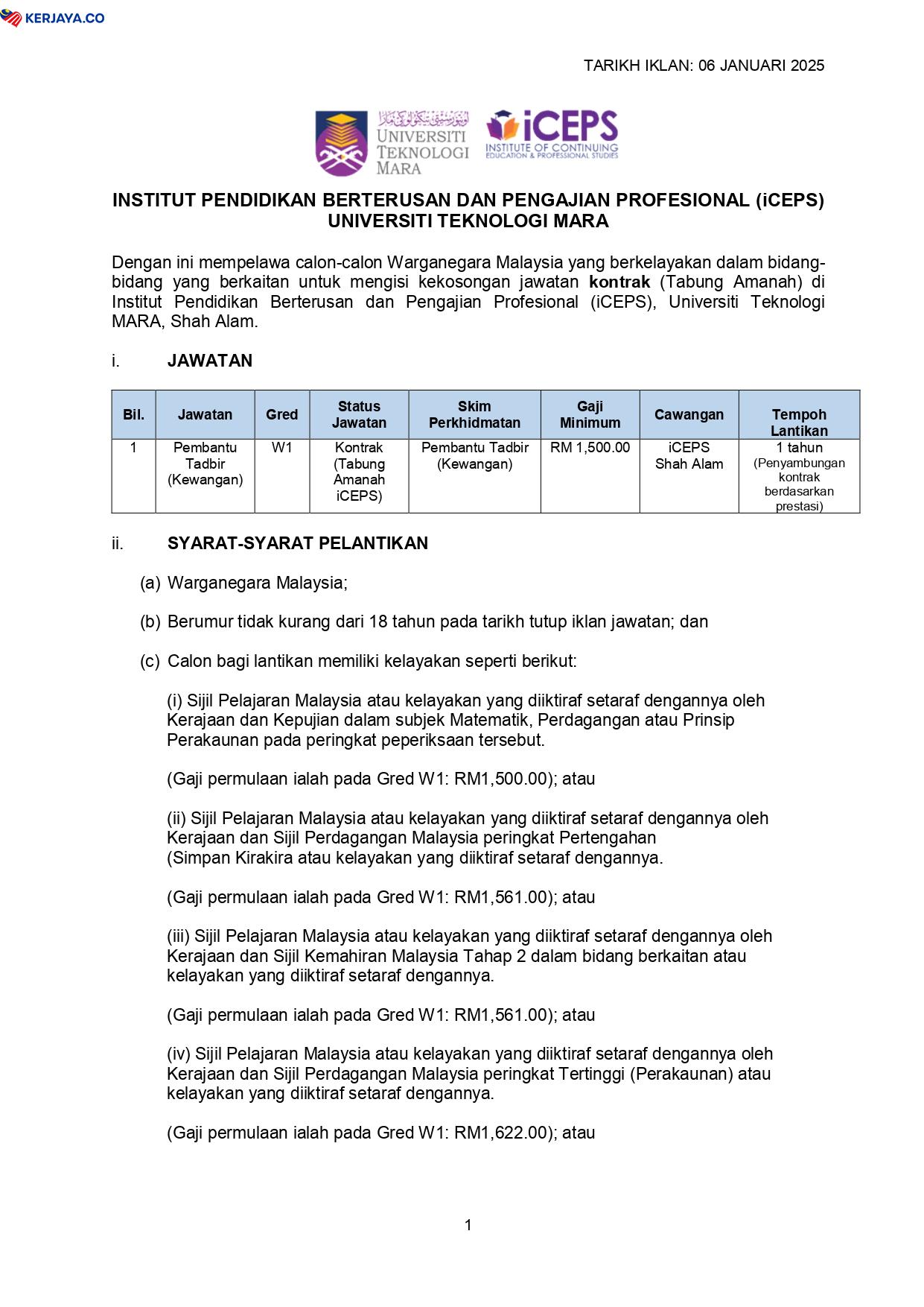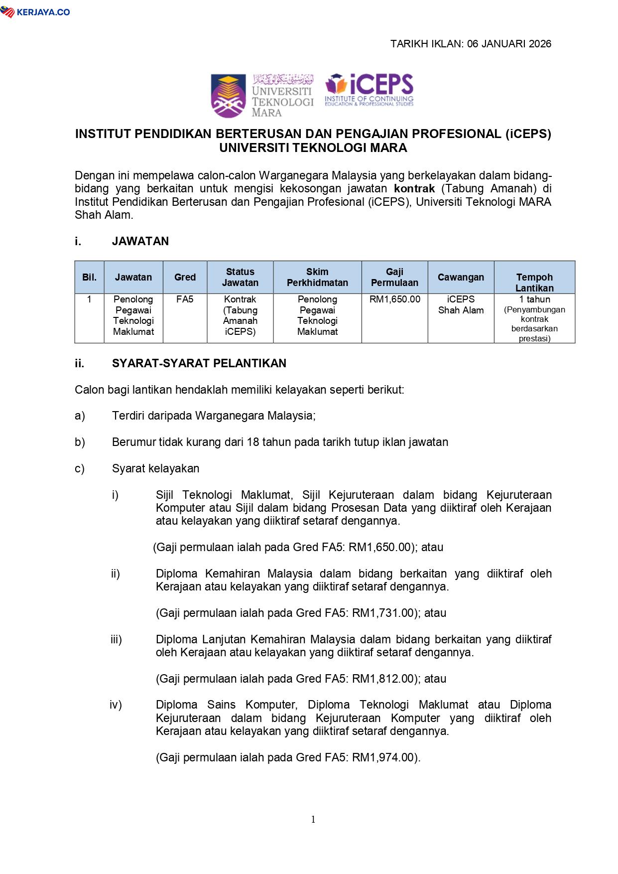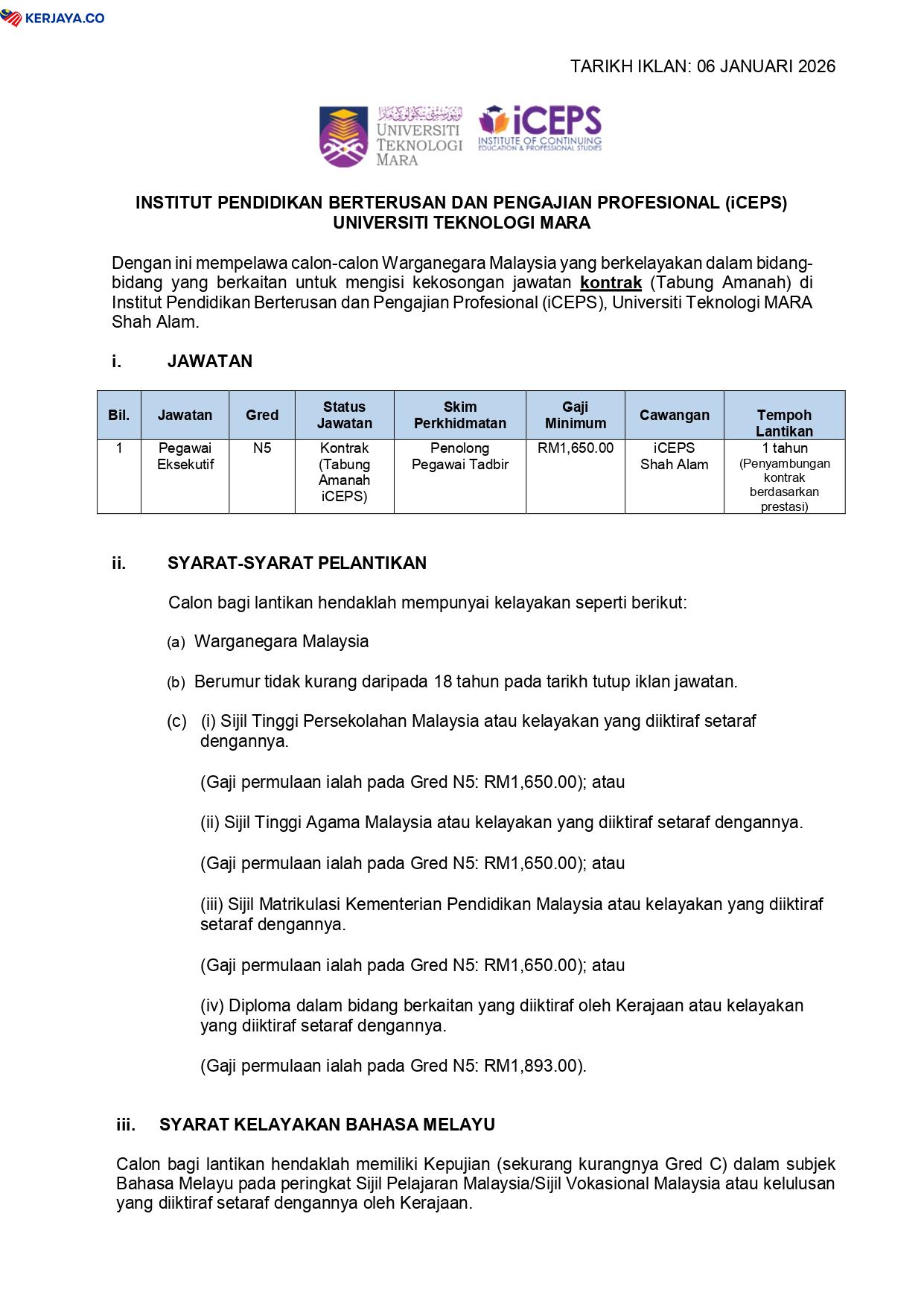Iklan Jawatan Institut Pendidikan Berterusan Dan Pengajian Profesional (iCEPS) UiTM IKLAN PENUH JAWATAN