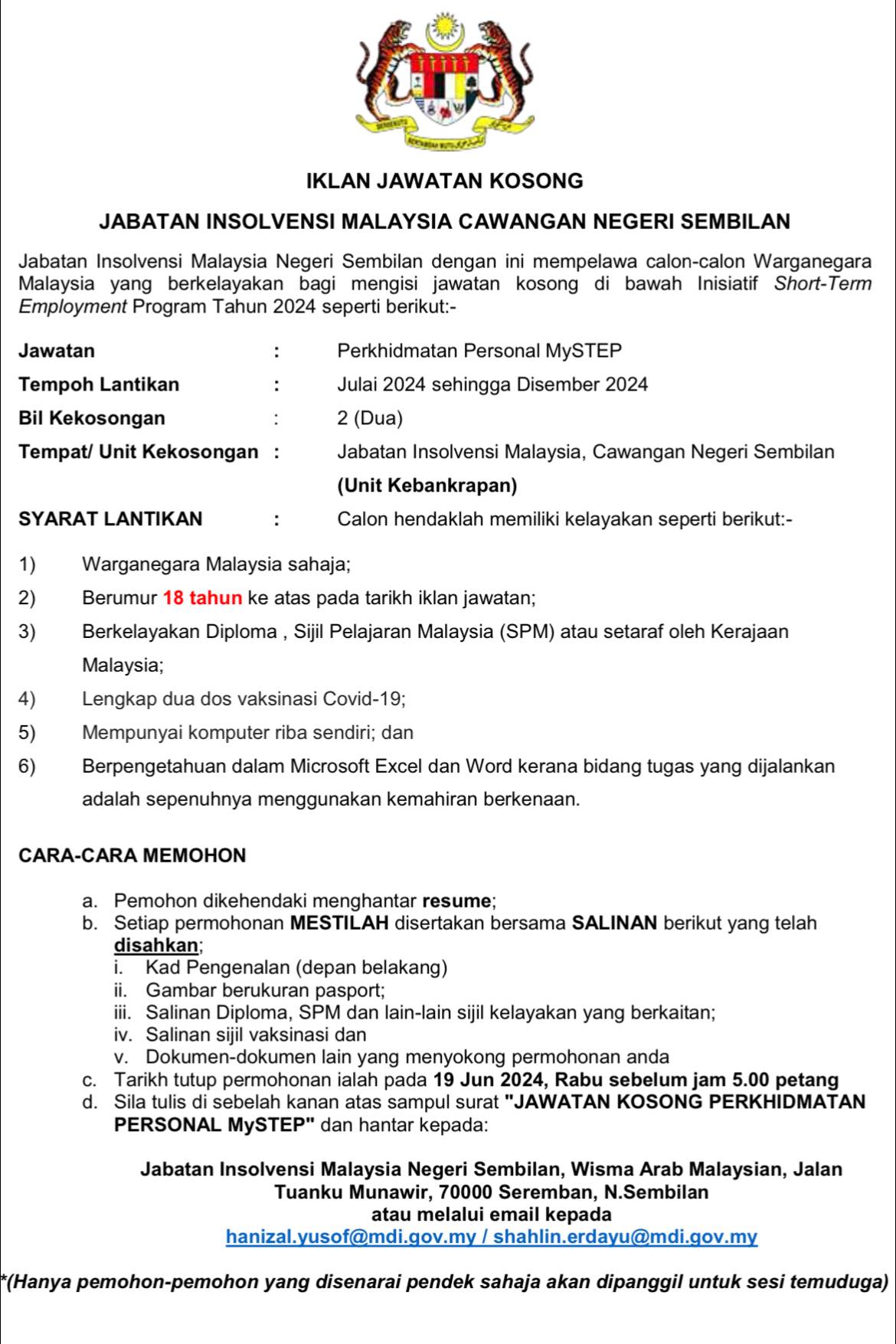 Iklan Jawatan Jabatan Insolvensi Malaysia Cawangan Negeri Sembilan