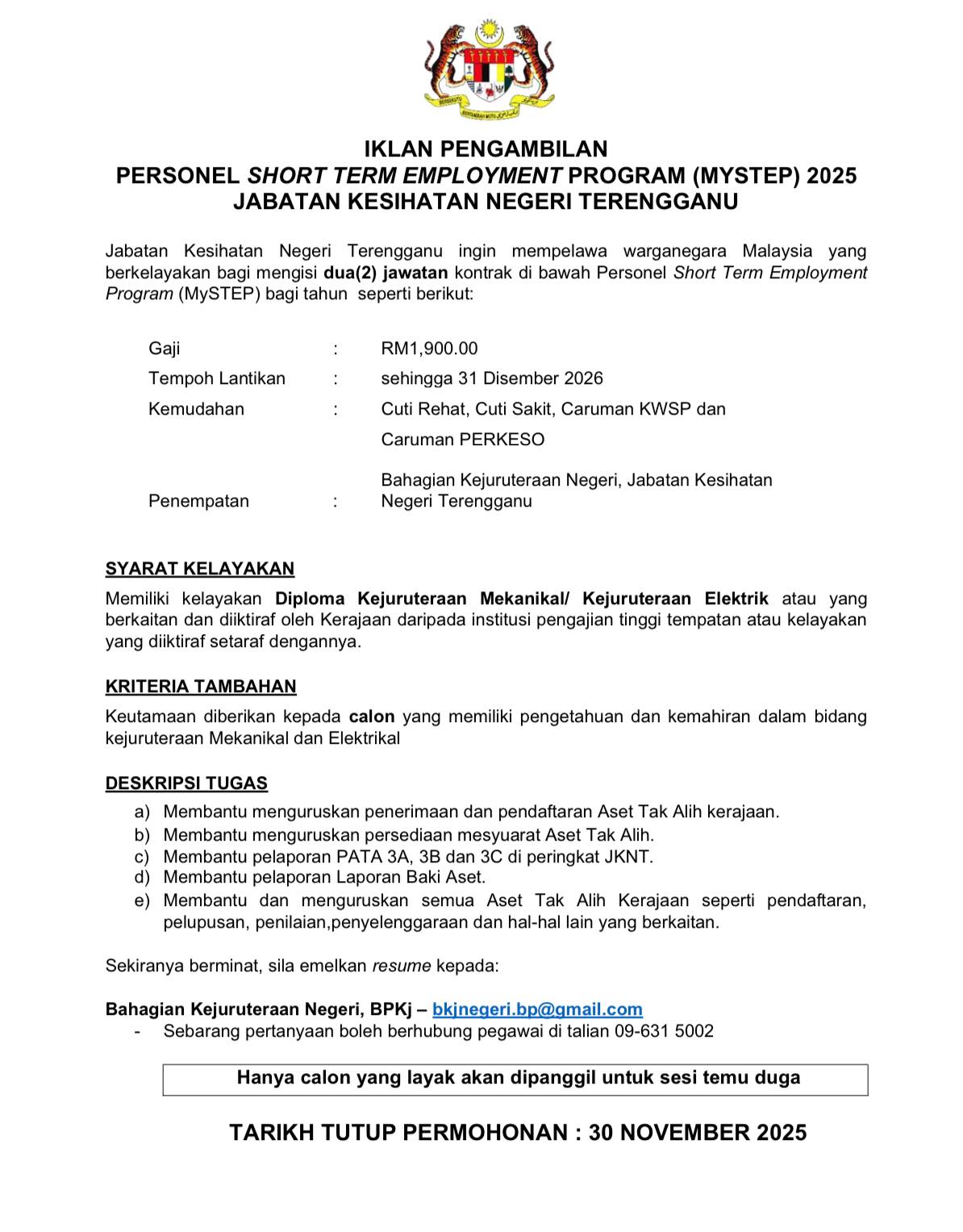 Iklan Jawatan Jabatan Kesihatan Negeri Terengganu