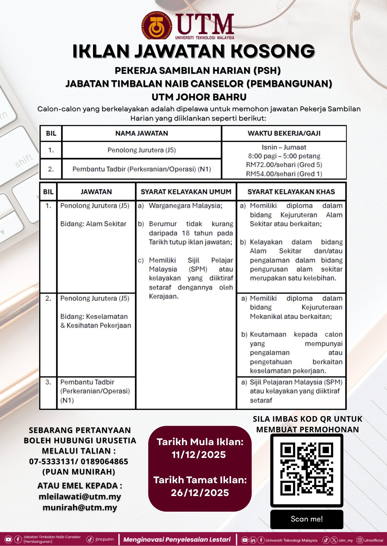 Iklan Jawatan Jabatan Timbalan Naib Canselor (Pembangunan), Universiti Teknologi Malaysia (UTM) Johor Bahr