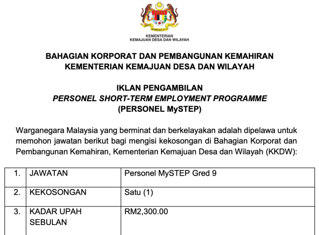 Iklan Jawatan Kementerian Kemajuan Desa & Wilayah ~ Jawatan Kosong Personel MySTEP Klik Iklan Jawatan Disini