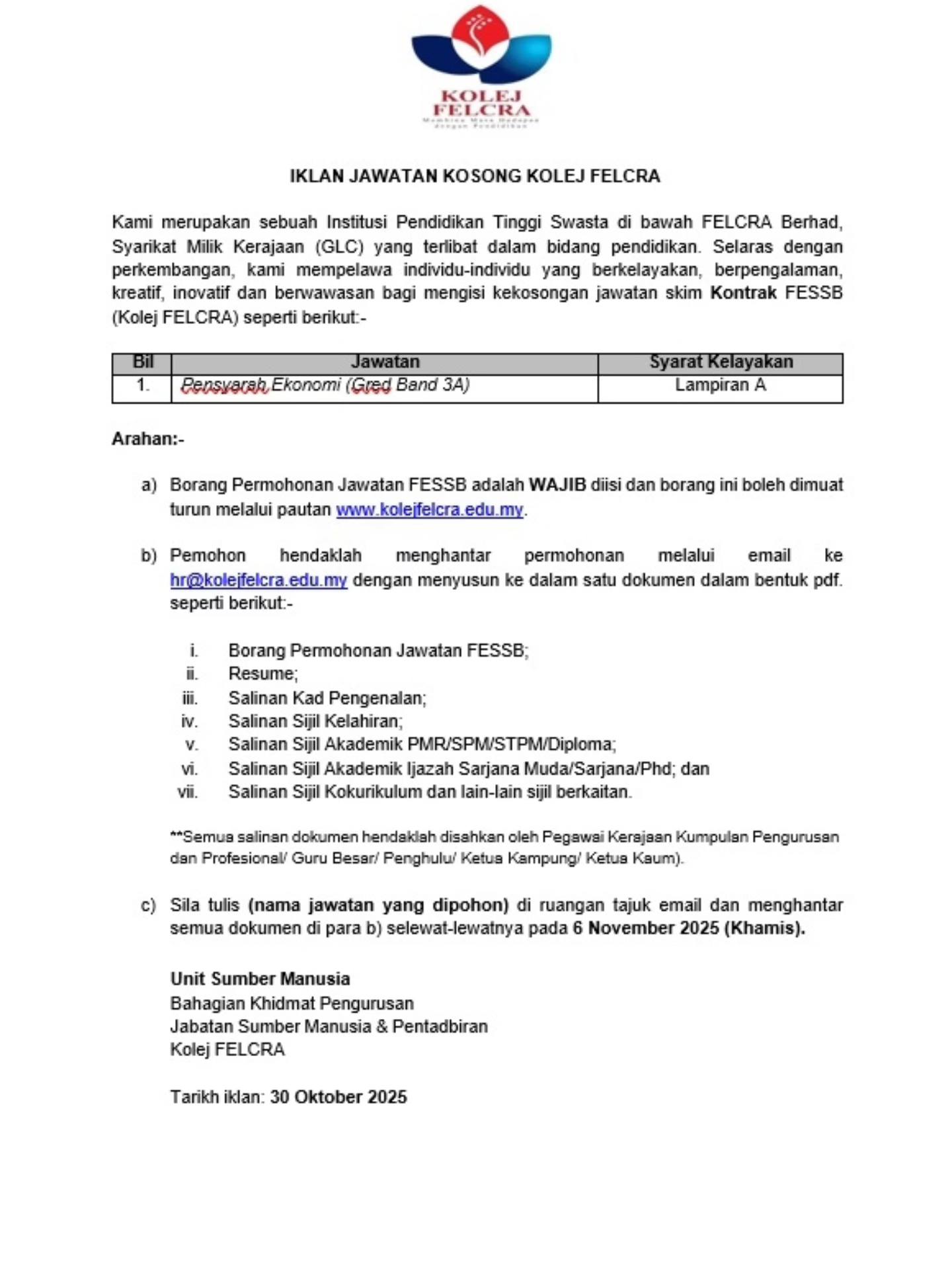Iklan Jawatan Kolej Felcra