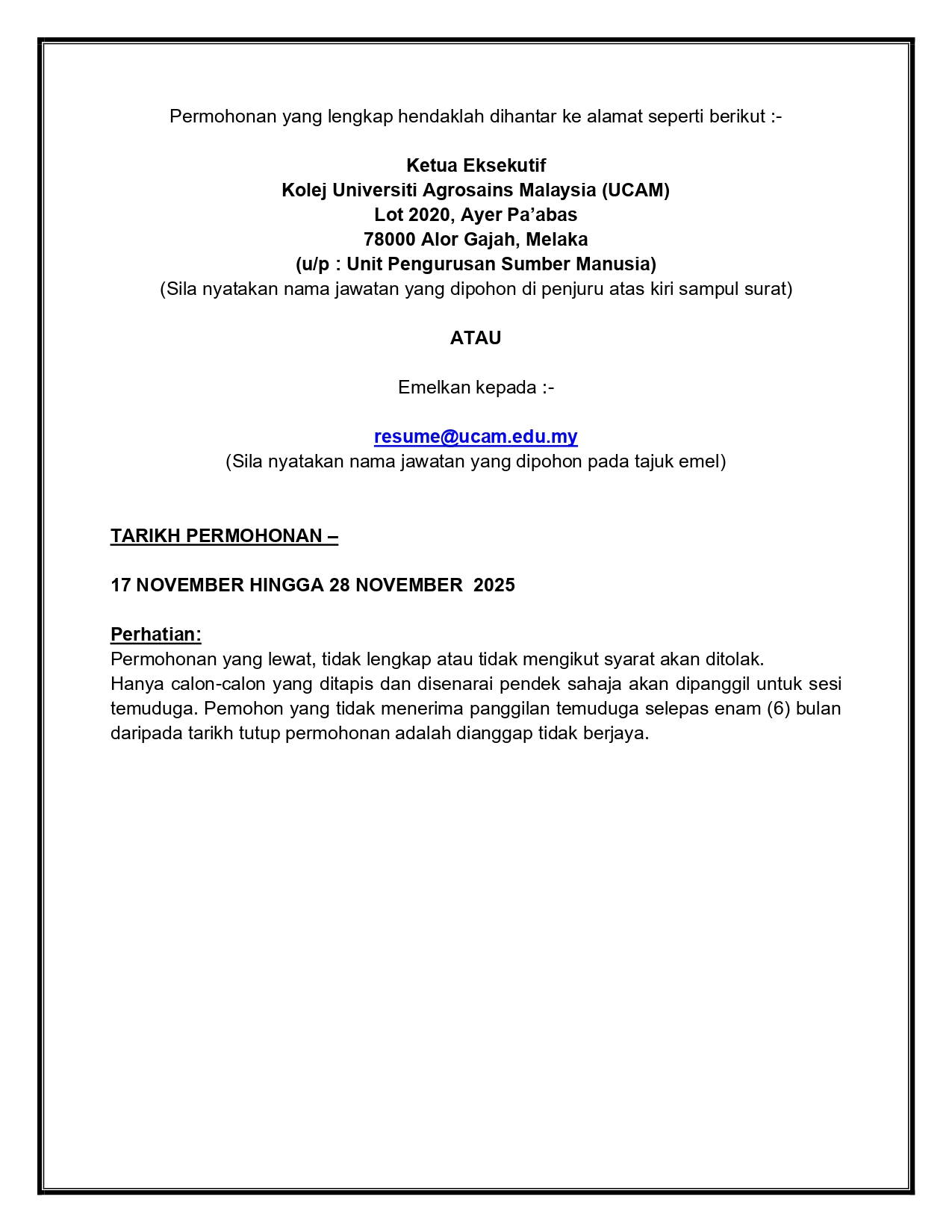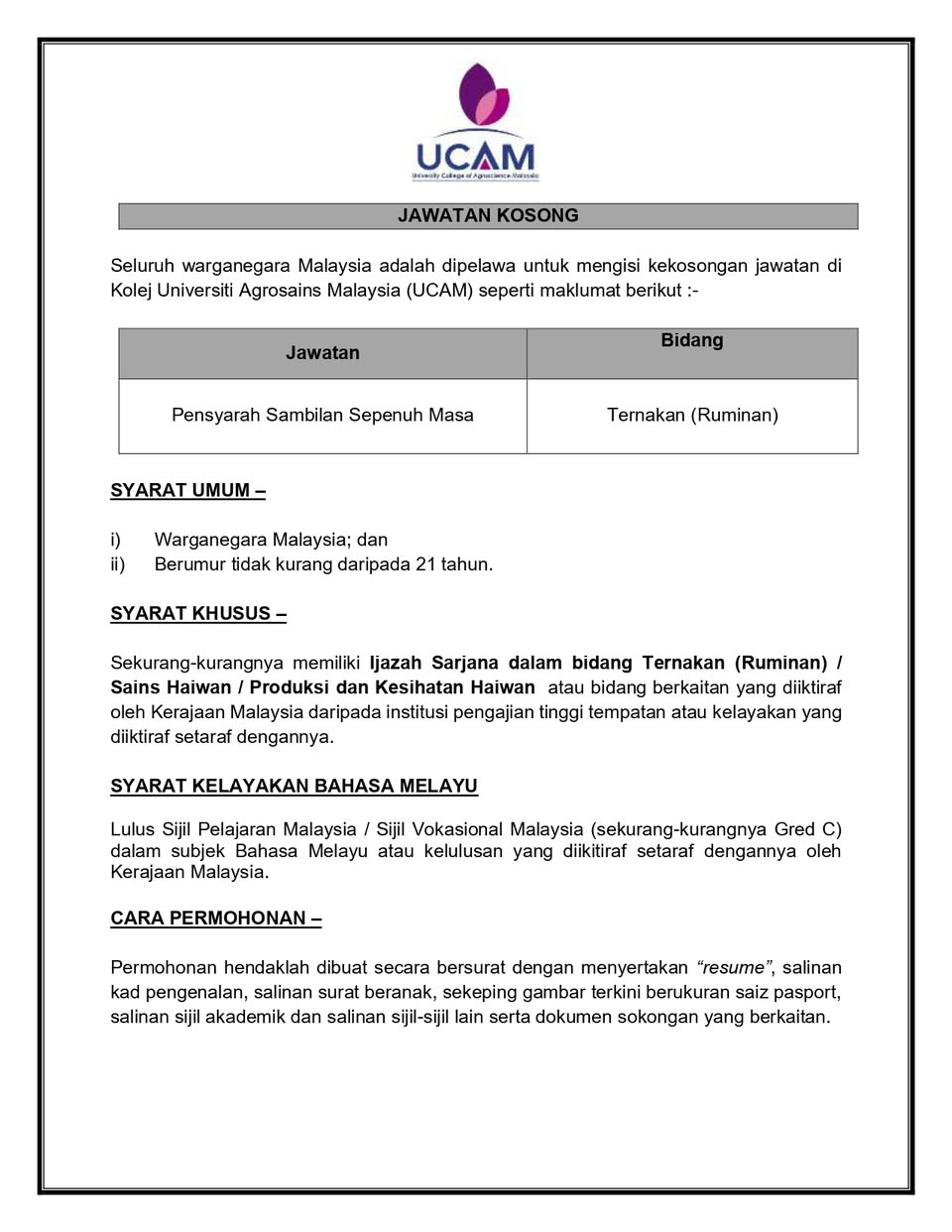 Iklan Jawatan Kolej Universiti Agrosains Malaysia (UCAM)