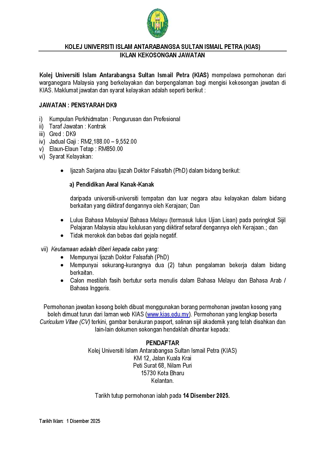 Iklan Jawatan Kolej Universiti Islam Antarabangsa Sultan Ismail Petra (KIAS)
