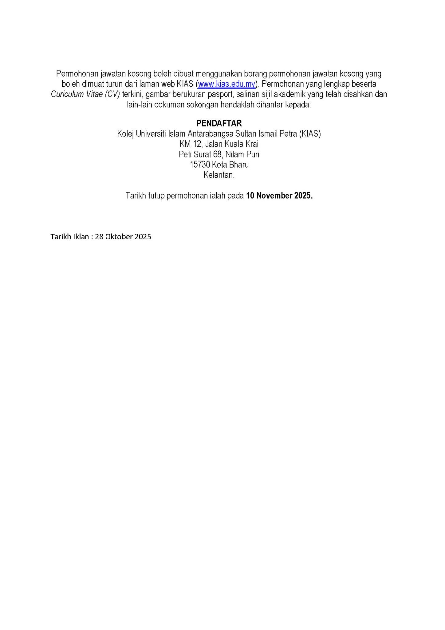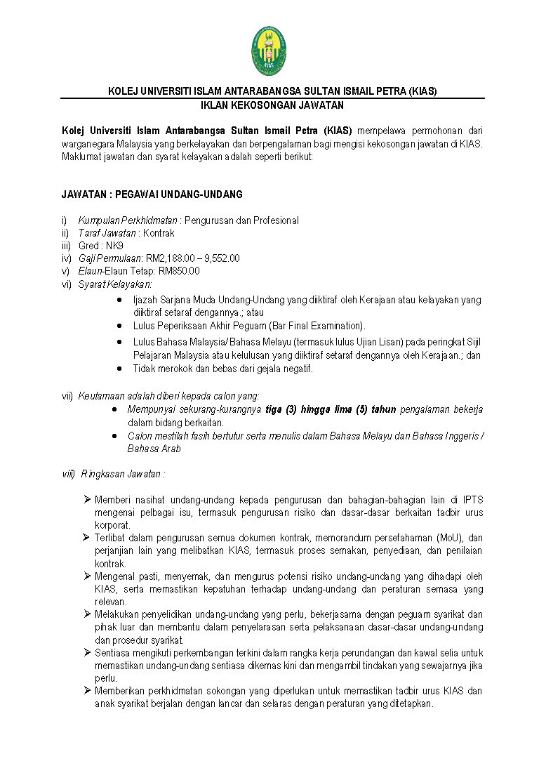 Iklan Jawatan Kolej Universiti Islam Antarabangsa Sultan Ismail Petra (KIAS)