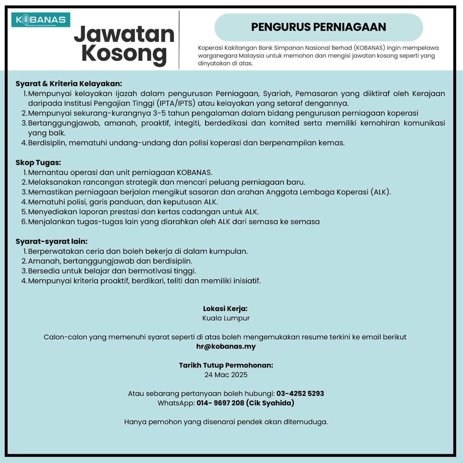 Iklan Jawatan Koperasi Kakitangan Bank Simpanan Nasional (KOBANAS)
