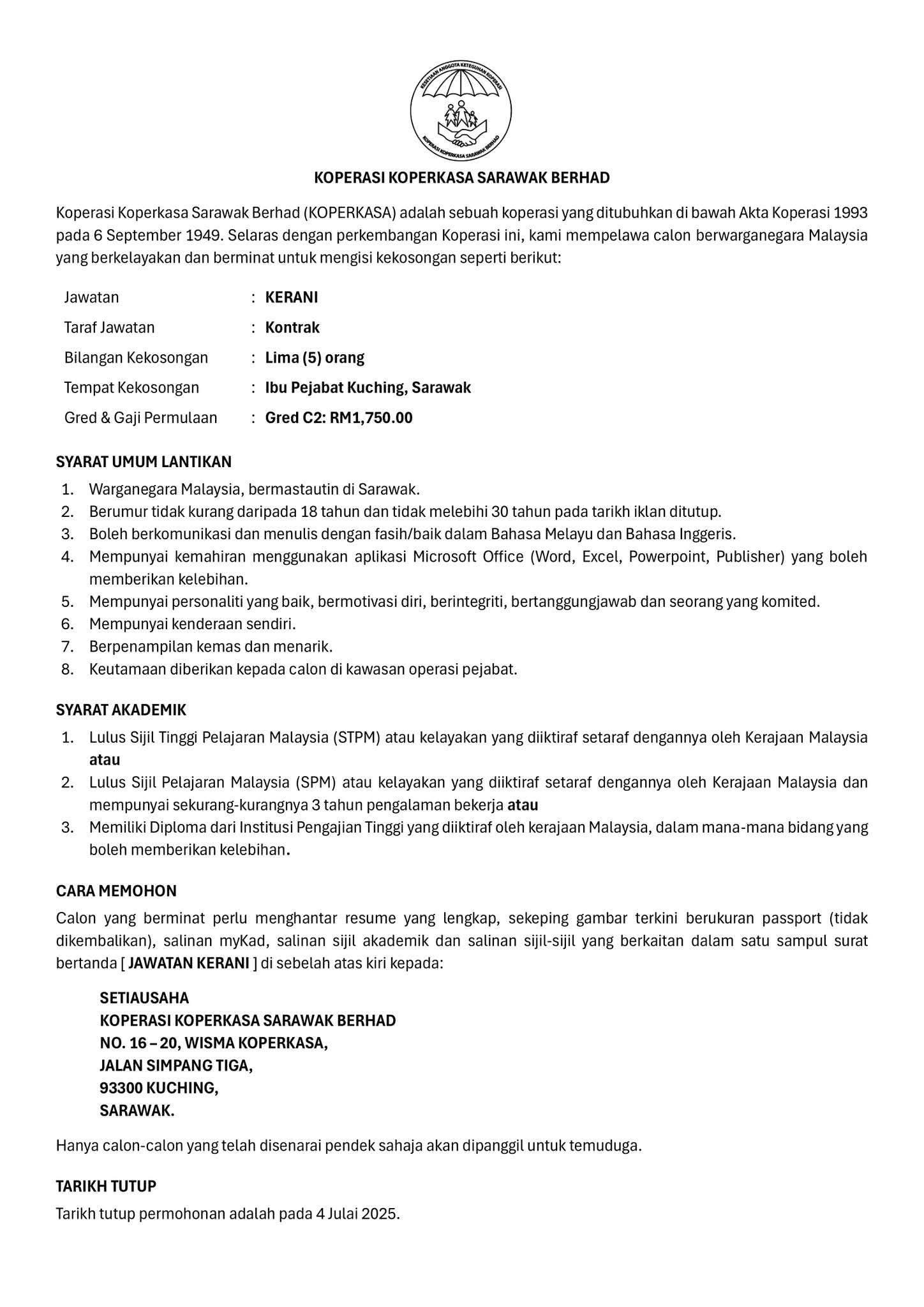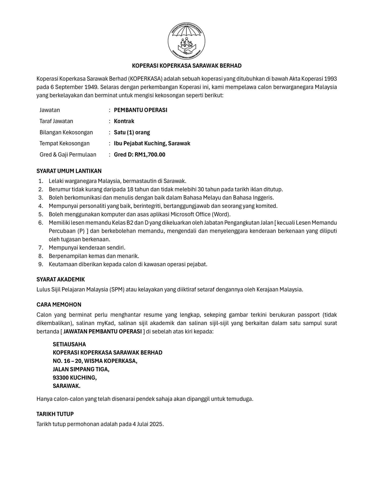 Iklan Jawatan Koperasi Koperkasa Sarawak Berhad