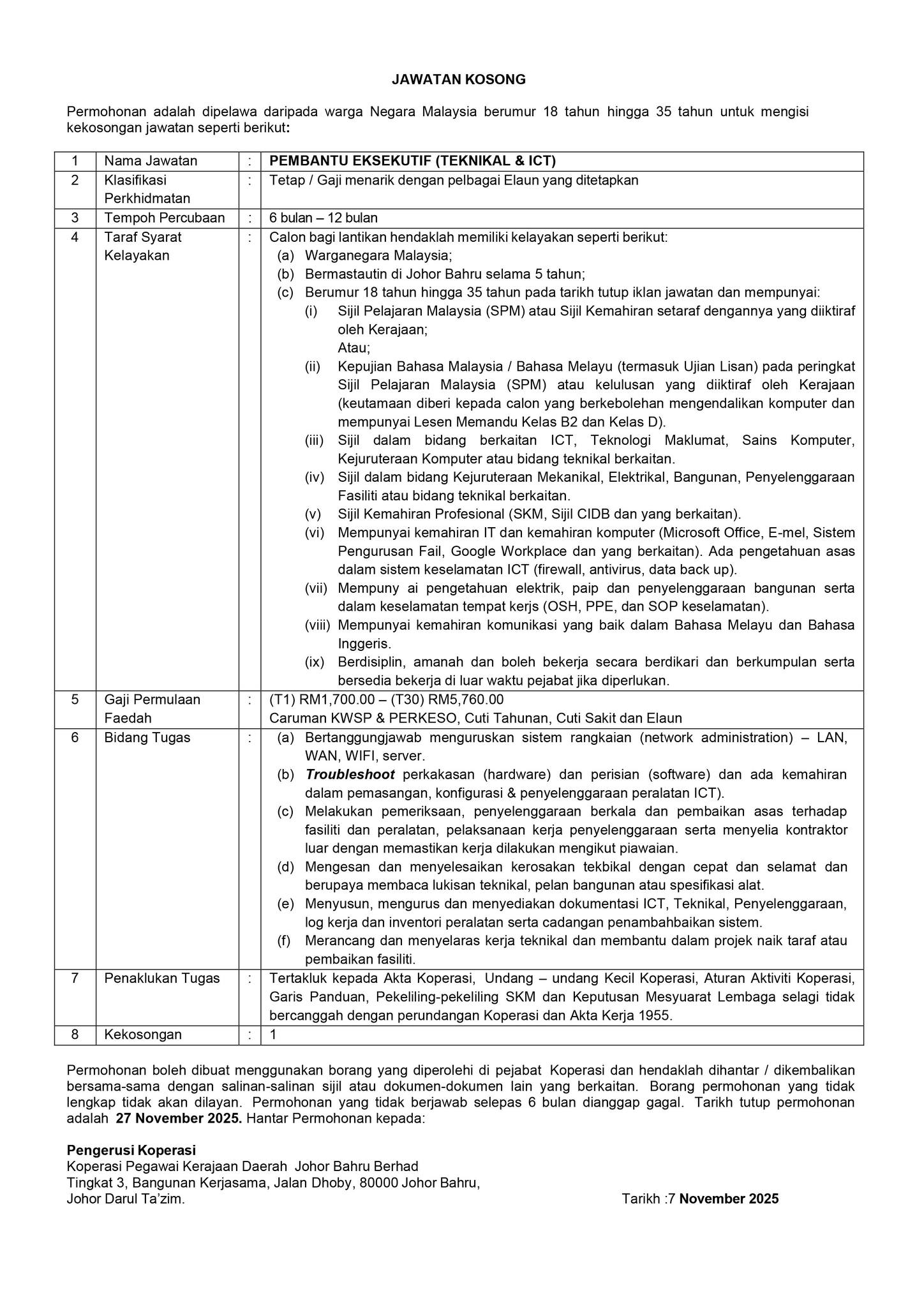 Iklan Jawatan Koperasi Pegawai Kerajaan Daerah Johor Bahru Berhad