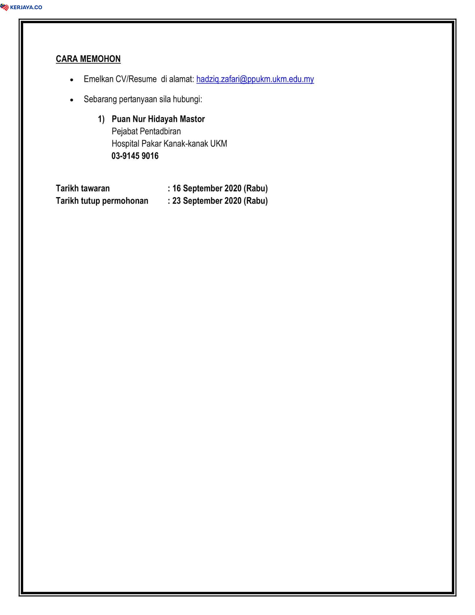 Iklan Jawatan Kosong Hospital Pakar Kanak-Kanak UKM