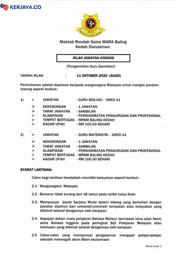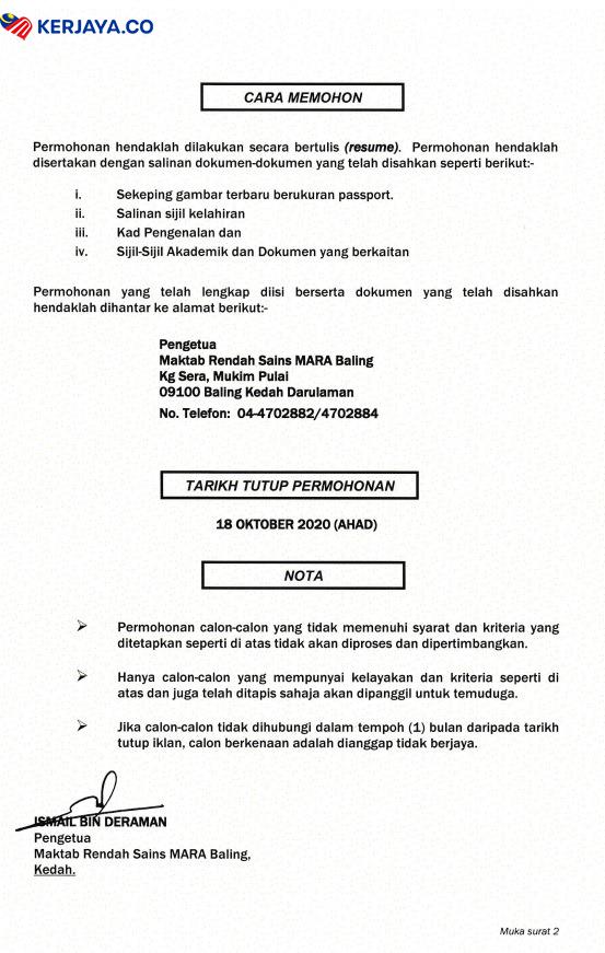 Iklan Jawatan Kosong Maktab Rendah Sains Mara (MRSM)