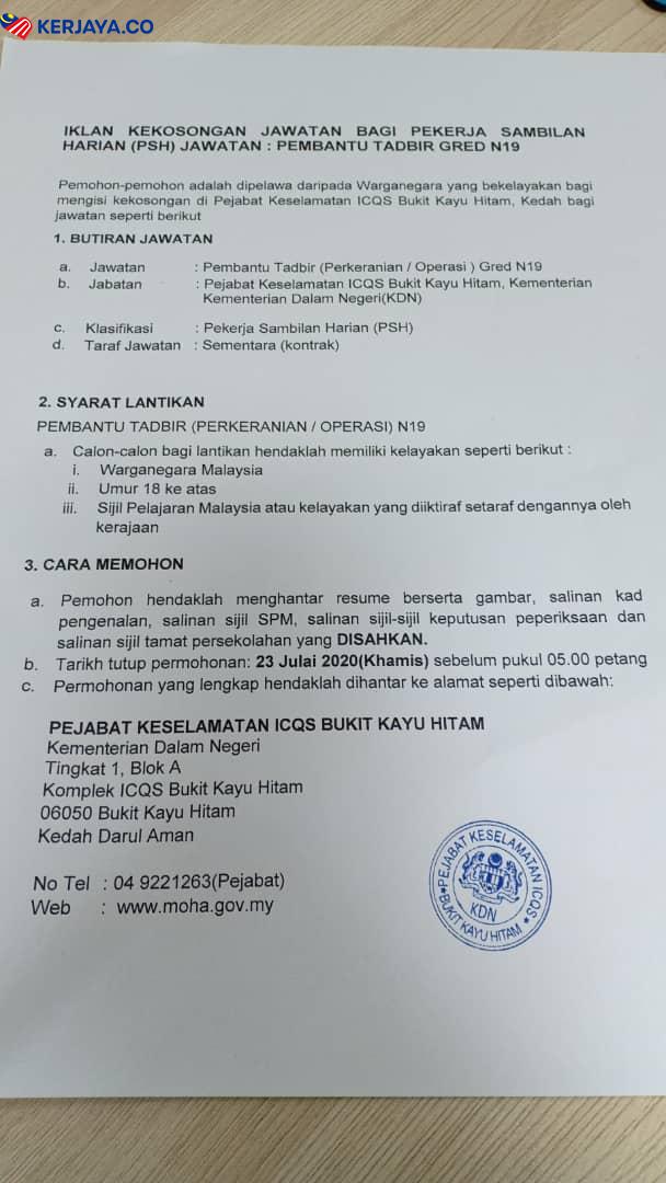Iklan Jawatan Kosong Pejabat Keselamatan ICQS Bukit Kayu Hitam , Kementerian Dalam Negeri