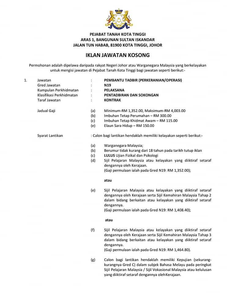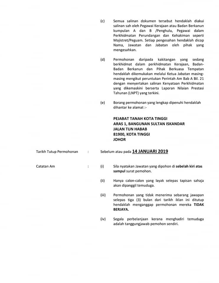 Iklan Jawatan Kosong Pejabat Tanah Kota Tinggi