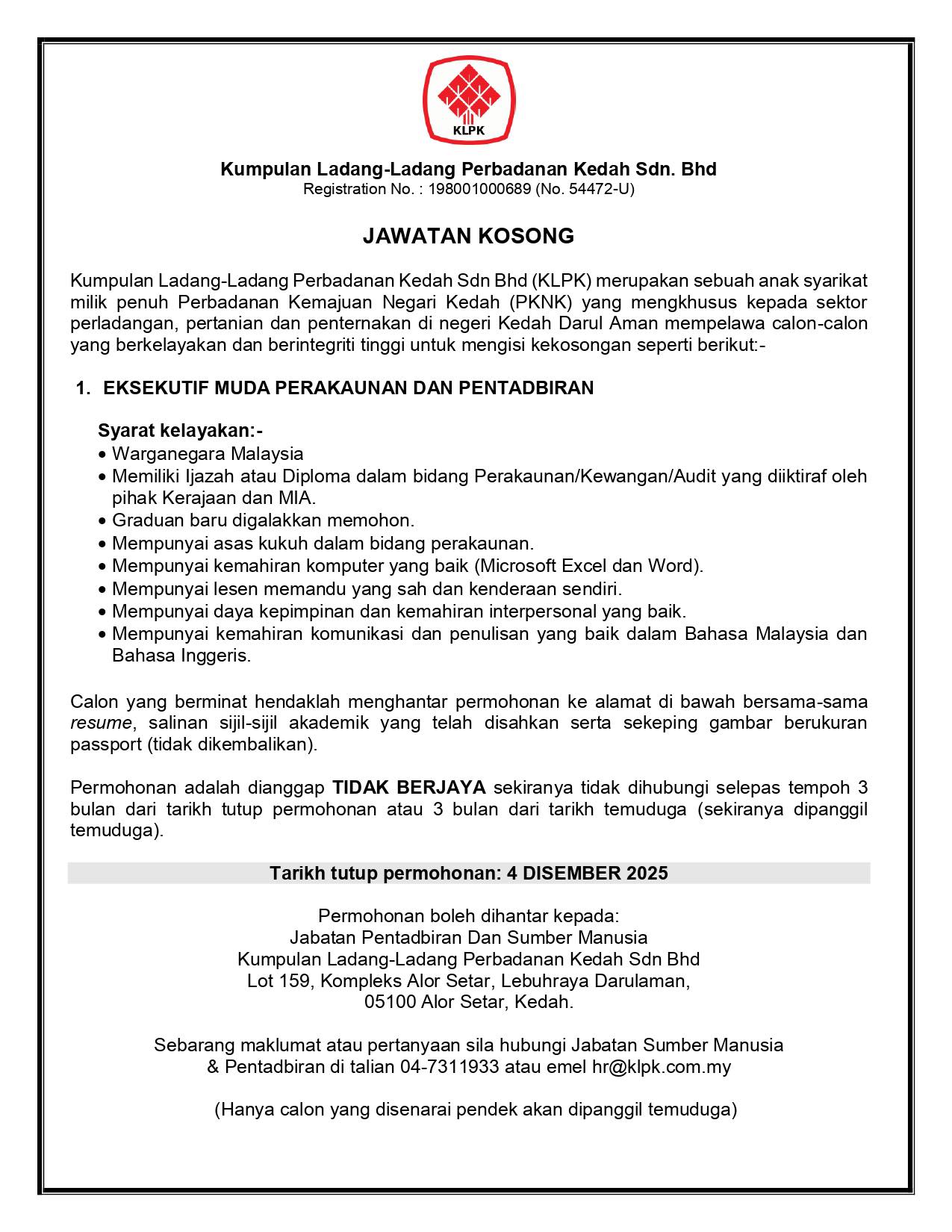 Iklan Jawatan Kumpulan Ladang-Ladang Perbadanan Kedah (KLPK)